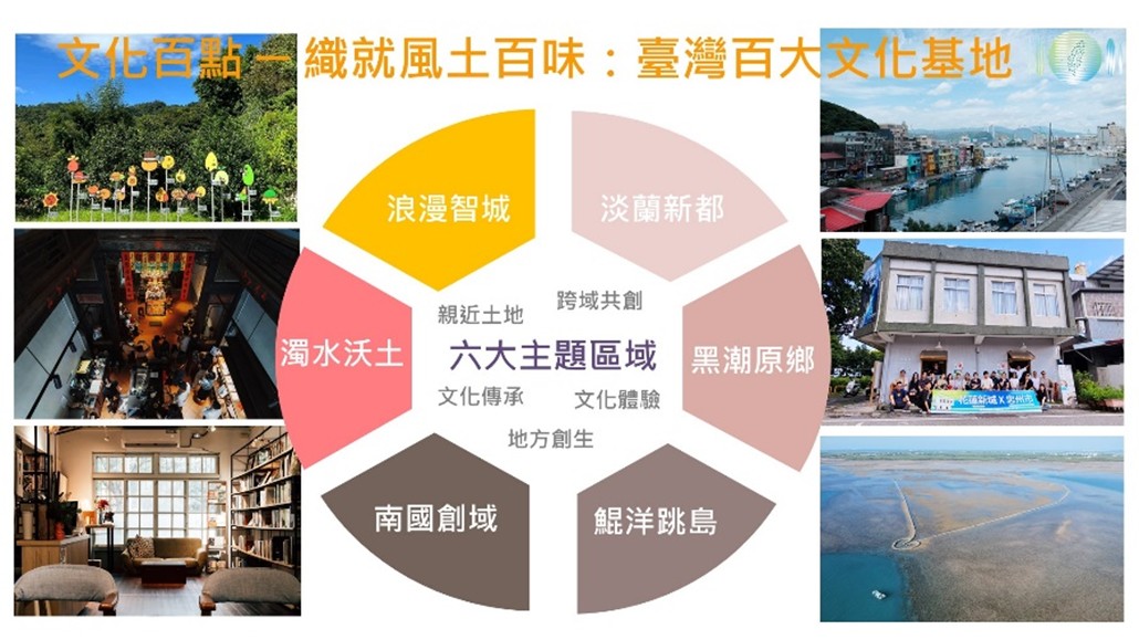 二、首屆百大文化基地係自1,026組名單中選出,共計110個基地。百大文化基地類型包含文創聚落或工藝據點;視覺藝術、表演藝術等藝文展演據點;獨立書店、雜誌社或出版社;博物館或地方文化館;社區營造或地方創生點;古蹟、聚落或文化路徑點,以及影視據點等7大類。另參考基地所處地理環境、生態及文化歷史等脈絡,並對應均衡臺灣六大區域,設定了北北基宜的「淡蘭新都」、桃竹竹苗「浪漫智城」、中彰投雲「濁水沃土」、嘉嘉南高屏「南國創域」、花東「黑潮原鄉」及金馬澎「鯤洋跳島」等6大區域主題,期整合呈現各地文化多樣性及區域發展特色。