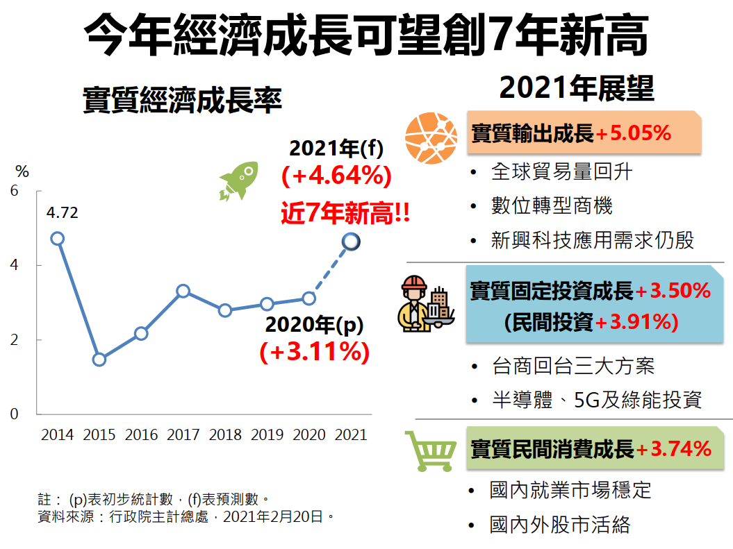 展望2021年,全球經濟可望從疫情造成的嚴重衰退中恢復,有助臺灣經濟進一步提升。行政院主計總處預估臺灣今年上半年經濟成長率達6~7%高成長,全年經濟成長率超越4%,將創7年新高,部分機構預測將達5%以上。鑒於疫情發展及疫苗效益、主要國家政策走向等不確定性仍存,政府除密切關注發展,亦賡續落實對於受疫情影響產業的紓困措施,並將掌握後疫情時代全球供應鏈重組契機,持續引導資金投入建設,做好促進內需發展及協助產業轉型升級之各項工作,以確保我國經濟穩定成長。
