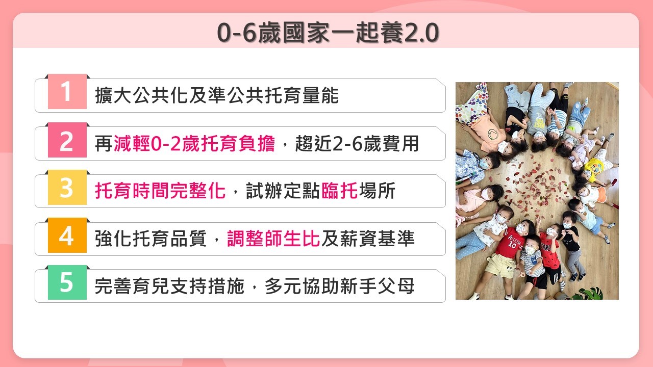 為落實賴總統所提「0-6歲國家一起養2.0」的精進策略,本院透過「提高0-2歲幼兒托育補助」、「積極設置2歲專班」、「提供公幼平日延長照顧與寒暑假加托服務」、「公共化幼兒園試辦臨時照顧服務」、「調降幼兒園師生比」及「試辦彈性育嬰留職停薪」等策略,讓年輕父母兼顧工作及家庭,並減輕家庭育兒負擔。目前執行情形如下: