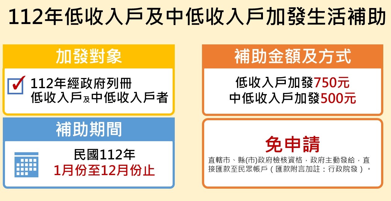 二、低收入戶及中低收入戶加發生活補助:自112年1月至112年12月,補助112年經政府列冊為低收入戶及中低收入戶者,低收入戶每人每月加發生活補助750元,中低收入戶每人每月加發500元。
