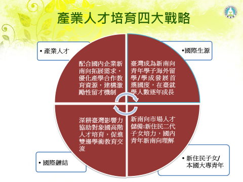 新南向產業人才培育四項戰略目標及對應策略包括:產業人才−配合國內企業新南向拓展需求,優化人才培育及技術訓練資源,及建構激勵性留才機制。大學生源−擴大我國高等及技職教育新南向發展資源效益,新南向國家學子來臺就學人數逐年成長20%。國際鏈結−強化我國與新南向國家鏈結,對接該國人才培育及技術人力訓練需求。新住民子女−建立新住民二代子女培力系統,推動新住民產業人才培育方案。