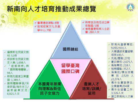- 在產業人才培育、訓練及留用方面,開辦新南向產學合作國際專班 92班2,931人,大學講師來臺留學培英專案100人,先修課程及雙聯專班27班,夏日學校2,675人來臺,高階專班218人參訓,短期蹲點352人參與,海青班2,529人、僑生技職專班2,274人就讀,僑外生實習媒合加入的企業會員204家,並新建新南向人才庫。