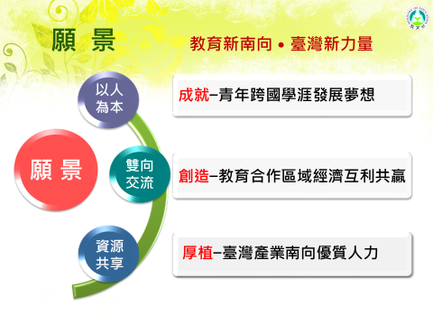 我國自105年起推動新南向政策,教育部配合規劃新南向人才培育推動計畫,並以雙向、多元、雙贏之交流原則,強調與東南亞及南亞國家建立廣泛連結,創造共同利益。