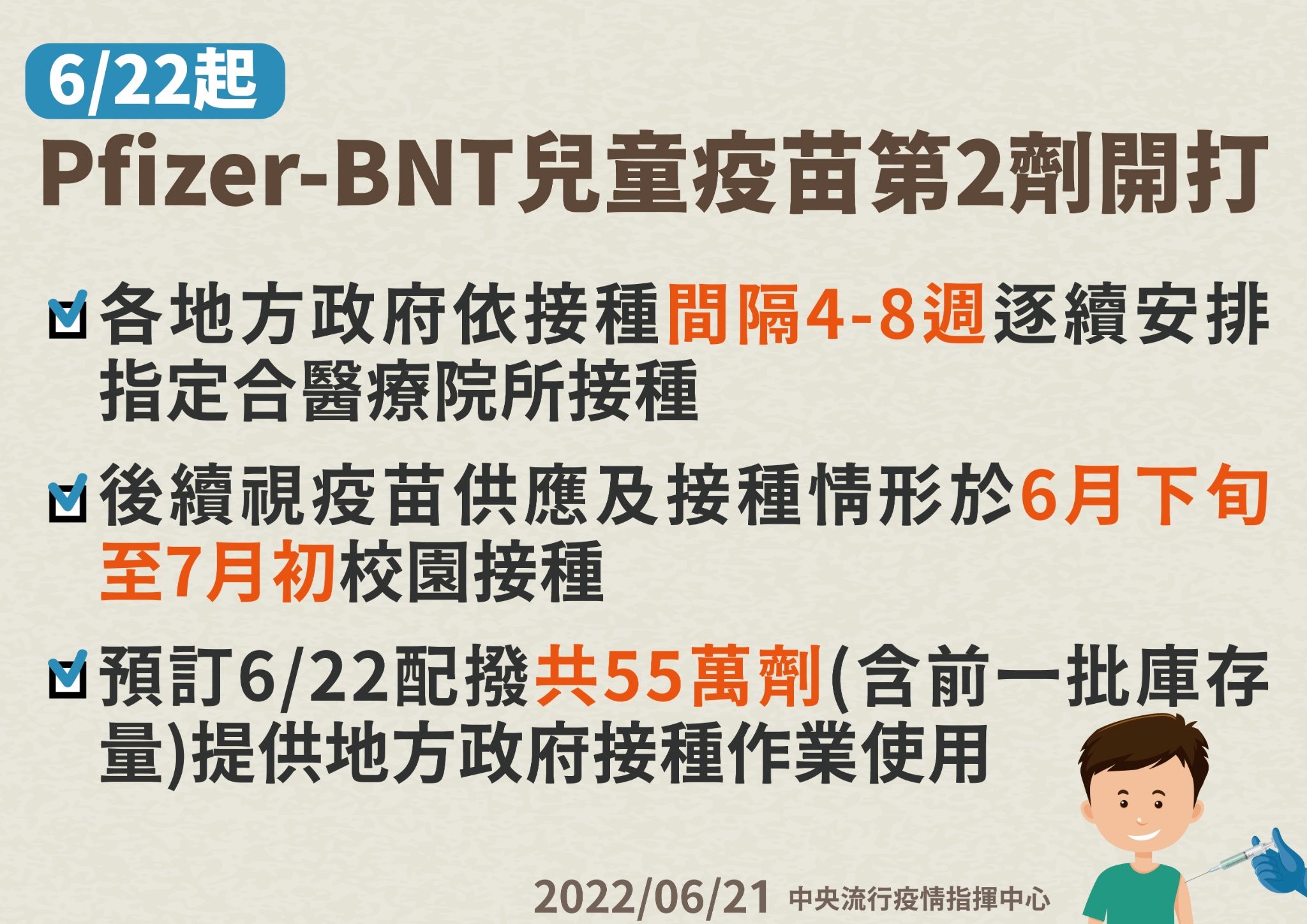 一、持續鼓勵接種疫苗:為強化國人保護力,中央流行疫情指揮中心今(111)年第三批採購輝瑞-BNT兒童劑型疫苗50.4萬劑,已於6月20日抵臺,並配撥輝瑞-BNT兒童劑型疫苗(共55萬劑)至各地方政府,各地方政府依接種間隔4-8週,陸續安排指定合約醫療院所接種,後續視疫苗供應及接種情形於6月底至7月初安排校園接種。