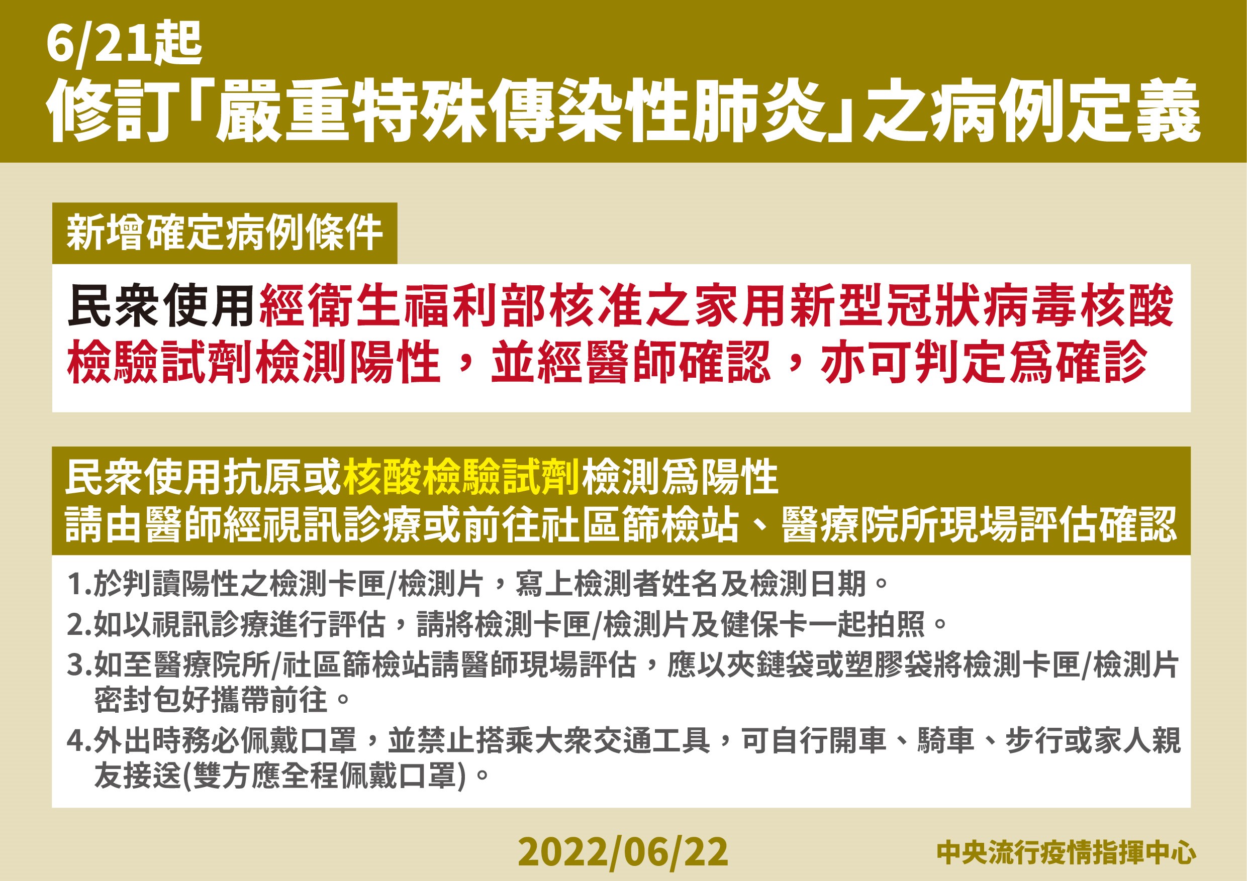 二、修訂病例定義:自6月21日起修訂「嚴重特殊傳染性肺炎」之病例定義,新增民眾使用經衛生福利部核准之家用新型冠狀病毒核酸檢驗試劑檢測陽性,並經醫師確認,亦可判定為確診。