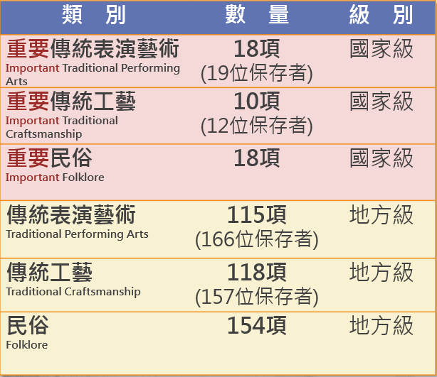 一、無形文化資產登錄情形:文化部登錄重要傳統表演藝術18項(19位保存者)、重要傳統工藝10項(12位保存者)、重要民俗18項;縣(市)政府登錄傳統表演藝術115項(166位保存者)、傳統工藝118項(157位保存者)、民俗154項。