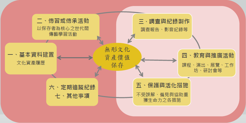 二、無形文化資產保護機制:依文資法第92條及施行細則第34條規定訂定保存維護計畫,內容為:基本資料建檔、調查與紀錄製作、傳習或傳承活動、教育與推廣活動、保護與活化、定期追蹤紀錄或其他。