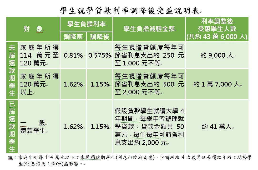 為降低學生就學貸款還款負擔,行政院宣布自105年8月1日起,調降就學貸款利率,全部受惠人數約達43萬6,000名。
