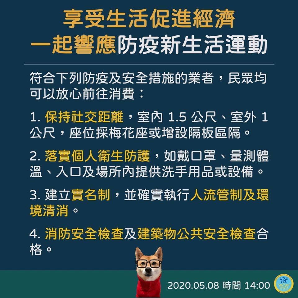 (十一) 由於國內疫情已穩定控制,為使民生及產業逐步恢復正常運作,自5月8日起,仍暫停營業之業者,經各縣市政府評估符合防疫及安全措施(保持社交距離、落實個人衛生防護、建立實名制,確實執行人流管制及環境清消、消防安全檢查及建築物公共安全檢查合格)後,可開放營業;此外,也鼓勵民眾可多前往配合防疫措施之店家消費。