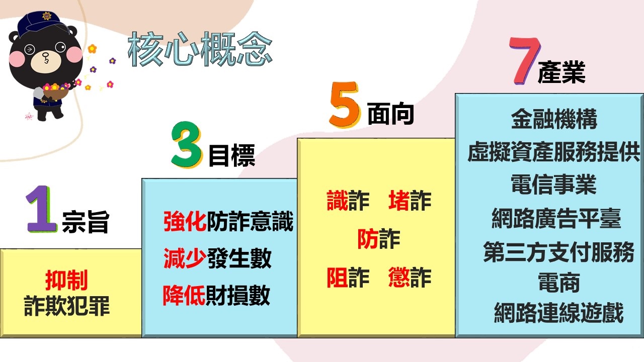 打詐綱領2.0版,延續跨部會合作機制,以「運用AI防制、深化跨境合作、監管關鍵產業、加強被害保護」為規劃重點,設立「強化防詐意識、減少發生數、降低財損數」3項目標,從「識詐、堵詐、防詐、阻詐、懲詐」5大面向著手,跨部會推動「厚植防詐知能、落實源頭(電信、網路、金融)管理、刨根溯源查緝」等相關工作,並與金融機構、虛擬資產服務提供、電信事業、網路廣告平臺、第三方支付服務、電商及網路連線遊戲等7大防詐關鍵產業公私協力,以收抑制詐欺犯罪危害之效,保障民眾財產安全。