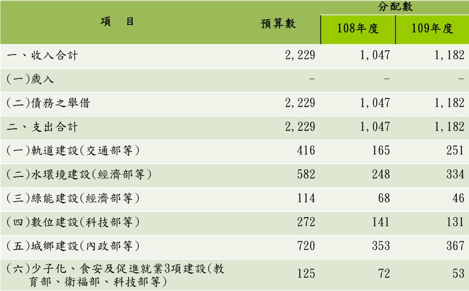 一、前瞻基礎建設計畫第2期特別預算案:本院原編收入、支出預算案數2,275億元,立法院審議後刪減為2,229億元,108年度分配數為1,047億元及109年度分配數為1,182億元。