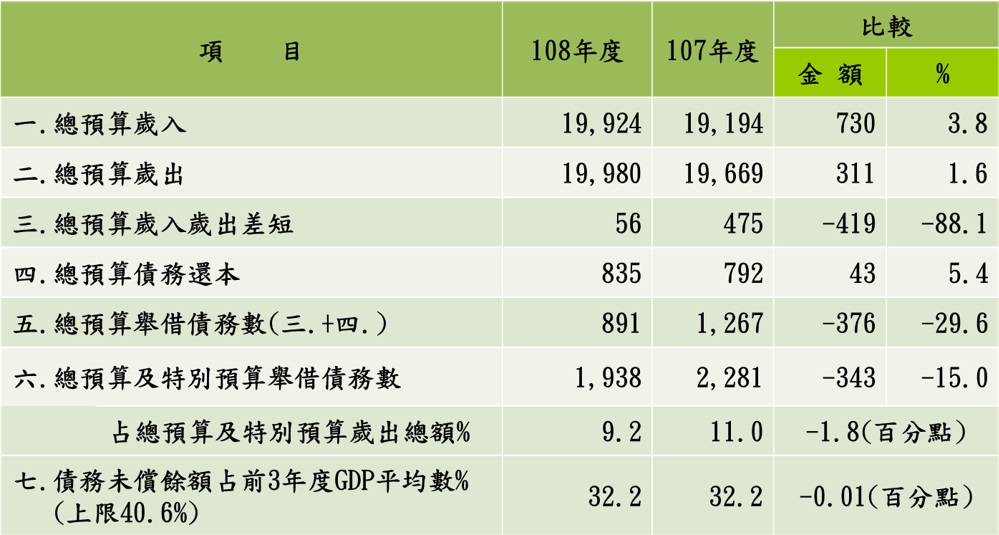 二、108年度中央政府總預算案暨附屬單位預算及綜計表:108年度中央政府總預算歲入1兆9,924億元,歲出1兆9,980億元,均較107年度有所成長;歲入歲出差短56億元,較107年度475億元減少419億元。另108年度總預算連同特別預算債務舉借占整體歲出總額9.2%,預計108年底累計債務未償餘額占前3年度GDP平均數32.2%,均符合公共債務法規定。