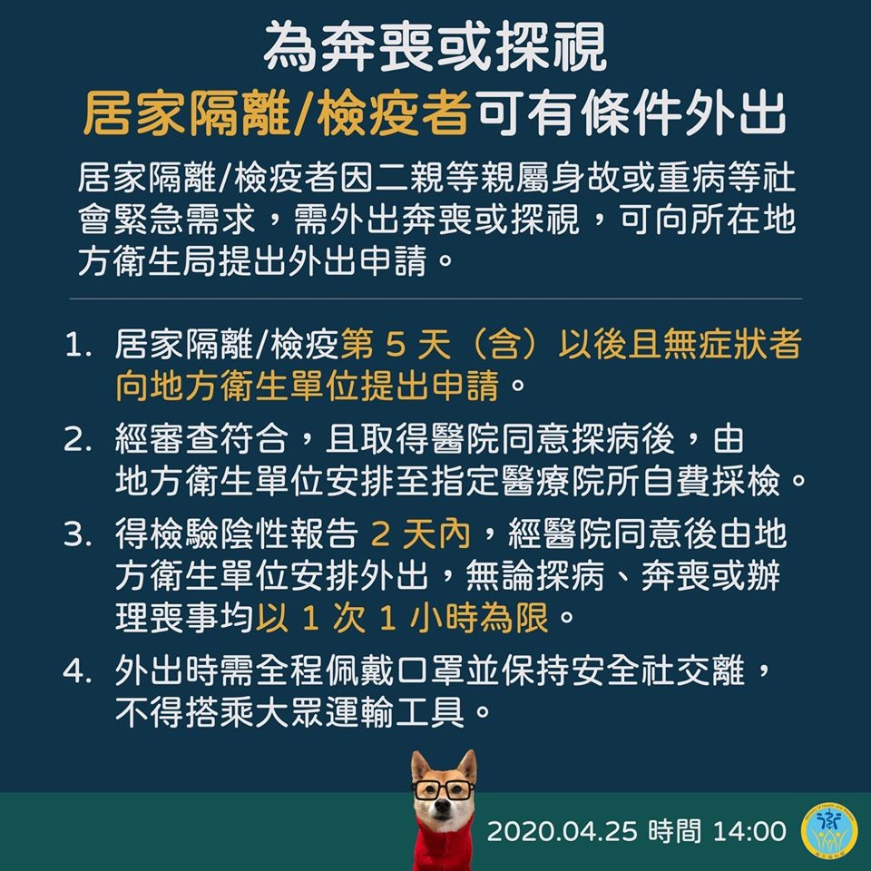(五)自4月25日起,居家隔離/檢疫者因二親等親屬身故或重病等社會緊急需求,需外出奔喪或探視,基於人道考量,開放其向所在地方衛生局提出外出申請,並訂定相關流程與規定供民眾及地方政府依循。