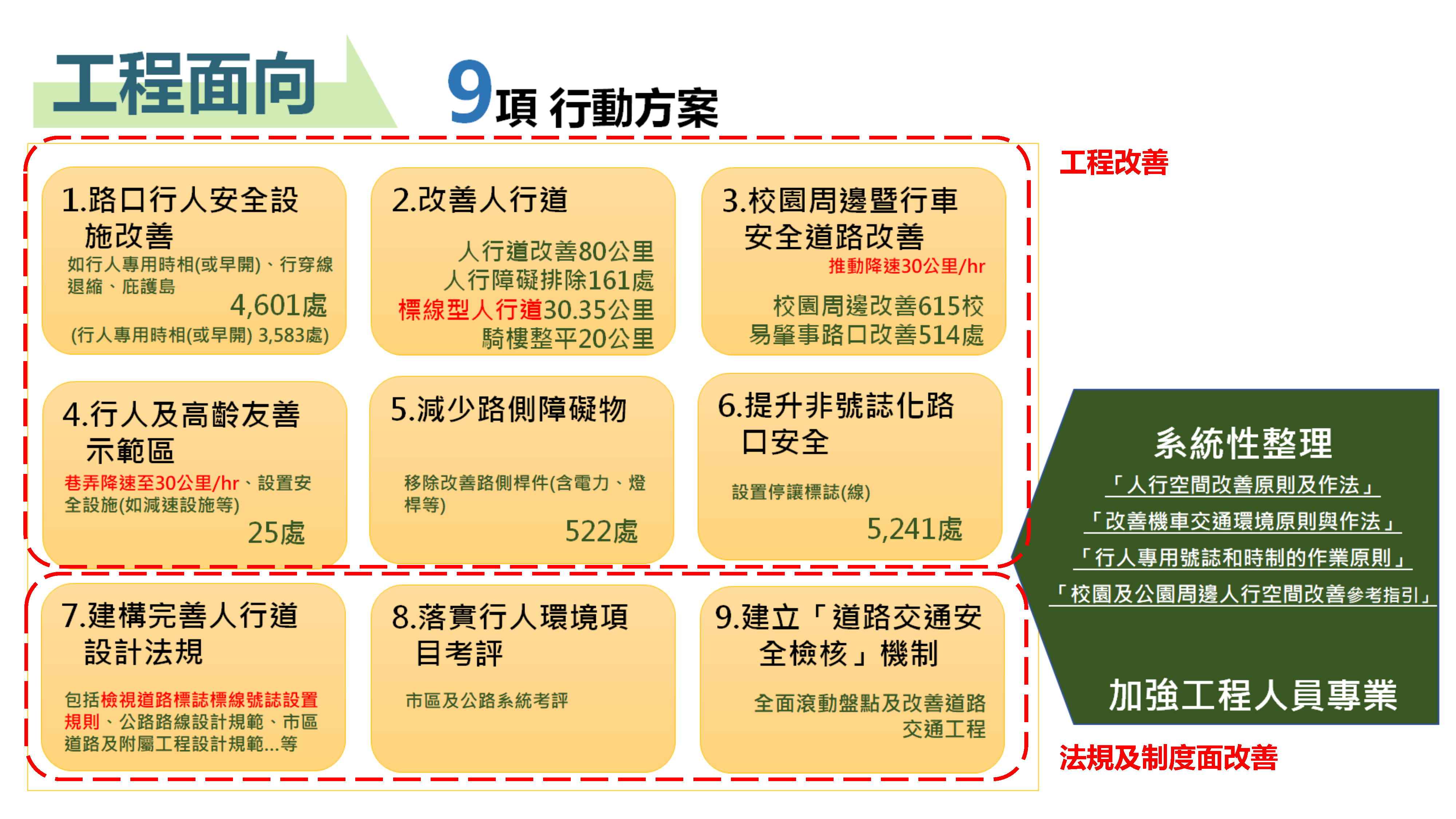 為有效提升國內行人路權,未來政府將持續精進相關改善工作,包括「路口行人安全設施改善」、「改善人行道」、「校園周邊暨行車安全道路改善計畫」、「行人及高齡友善示範區」、「減少路側障礙物」、「提升非號誌化路口安全」、「建構完善人行道設計法規」、「落實行人環境項目考評」及「建立道路交通安全檢核機制」等9項行動方案,從工程與法規等面向,系統性的改善人行環境所面臨到的問題與困境。