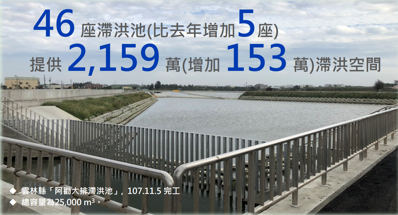 (2)滯洪池46座,滯洪量增至2,159萬立方公尺。