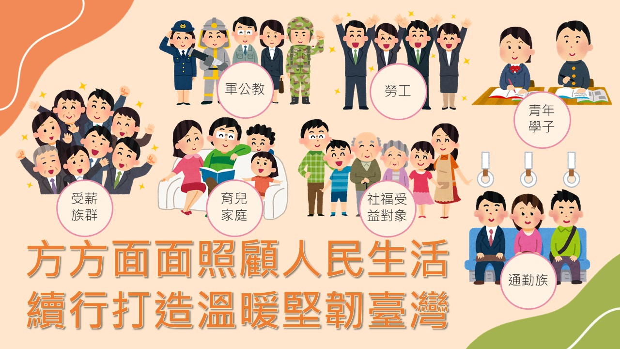 福利增加方面,調增國民年金各項給付金額、社福及老農津貼,預估分別約有172.9萬人(國民年金)、67萬人(社福津貼)及54萬人(老農津貼)受惠;拉近公私立學校學雜費差距及其配套措施,定額減免私立大專學生學雜費每年3.5萬元,經濟弱勢學生再加碼減免1.5萬元至2萬元,並推動高中全面免學費;大專校院學生校內住宿補貼,每學期補貼每名住宿生最高5,000元,經濟弱勢身分每名補貼7,000元;擴大成年禮金(文化幣)發放對象為16歲至22歲青年,每人每年1,200點文化幣。