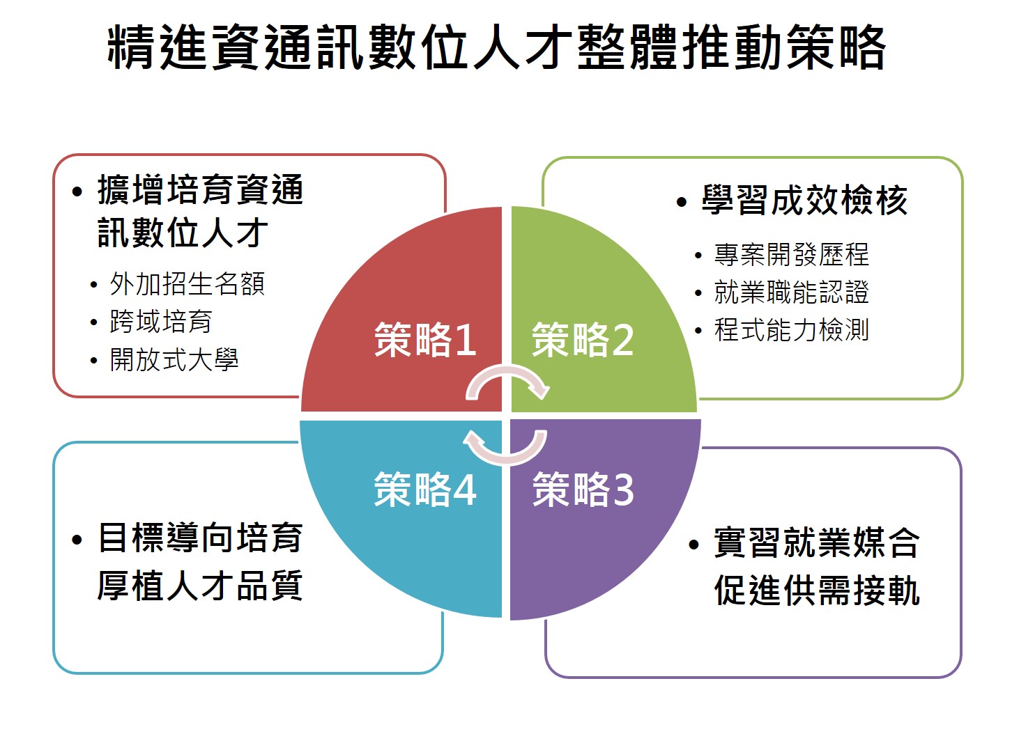 為5+2產業創新,配合臺商回流,行政院科技會報辦公室推估我國產業數位轉型需求人才,針對具備跨領域和資通訊數位能力的高階人才,到2030年將有約8.3萬的人才缺口。為補足這個缺口,教育部提出未來11年間,逐年擴增大學培育資通訊數位人才的量與質,以支持我國產業數位轉型所需人才。實施策略如下:
