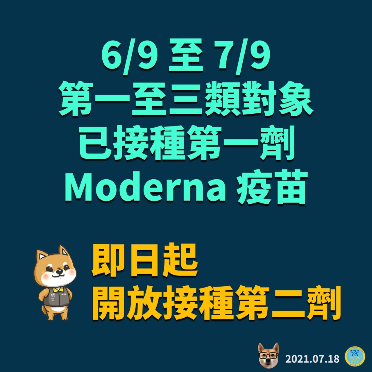 三、為使疫苗資源有效運用,自本年6月9日至7月9日為止,已接種第一劑Moderna疫苗之第一類至第三類對象及孕婦,共計18萬9,788人可於8月6日之前(接種間隔至少28天)接種第二劑Moderna疫苗。本年5月11日至5月23日之間已接種第一劑AstraZeneca疫苗的民眾,自下週起將陸續間隔滿10週,可透過COVID-19疫苗預約系統意願登記接種第二劑,或至COVID-19疫苗合約醫療院所預約。請地方政府衛生局偕同合約醫療院所提供前述對象完成二劑疫苗接種,以提升第二劑疫苗覆蓋率。指揮中心亦將持續視疫情狀況及疫苗供貨情形,滾動調整接種政策。