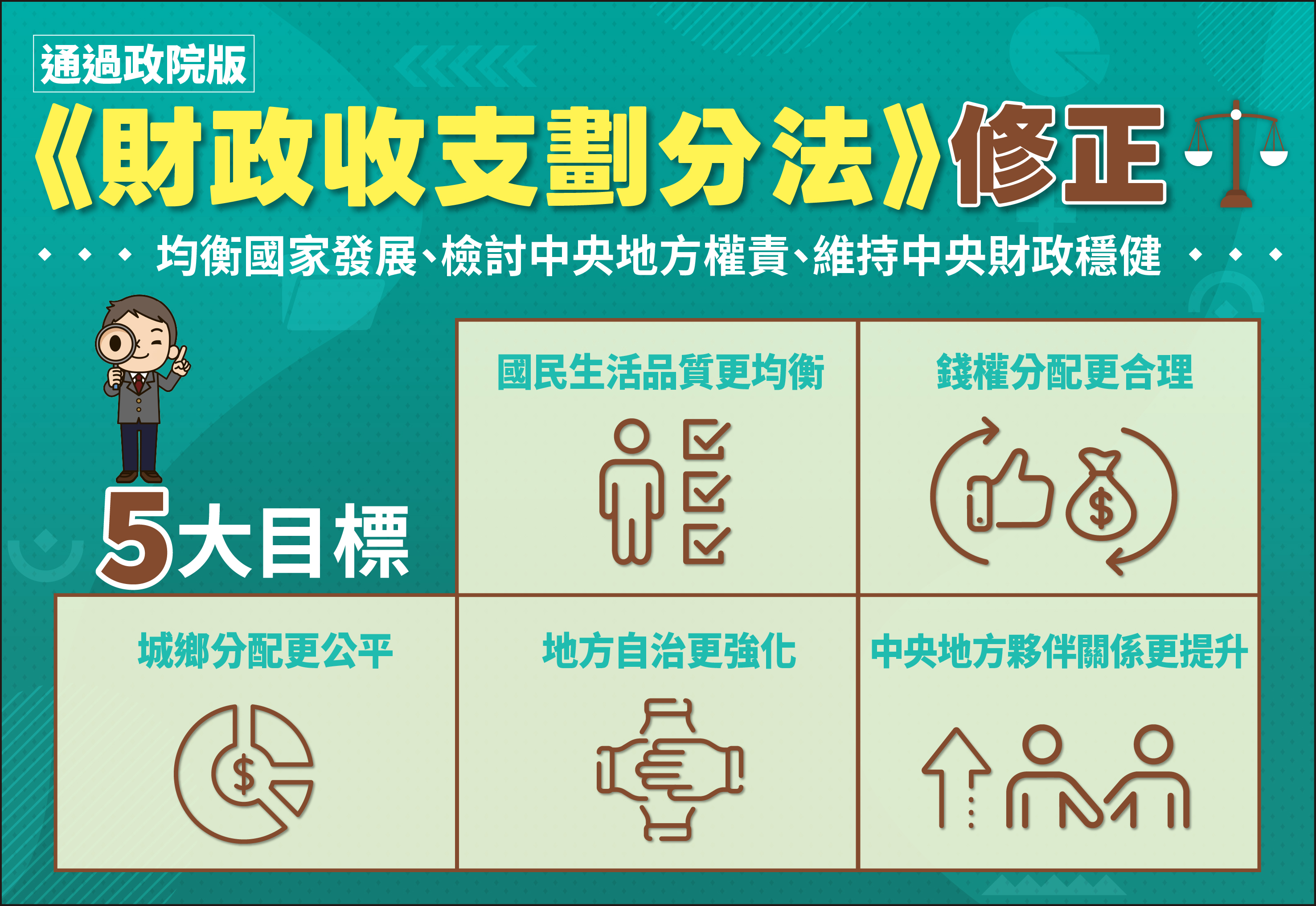《財劃法》是國家財政的根本大法。政府希望透過本次修法,制定更為合理、完善之分配機制,讓中央有足夠能力協助地方、地方有充足自主財源推動施政、人民享有均等生活品質,確保國家永續發展及人民福祉,並逐步達成「均衡臺灣」願景。