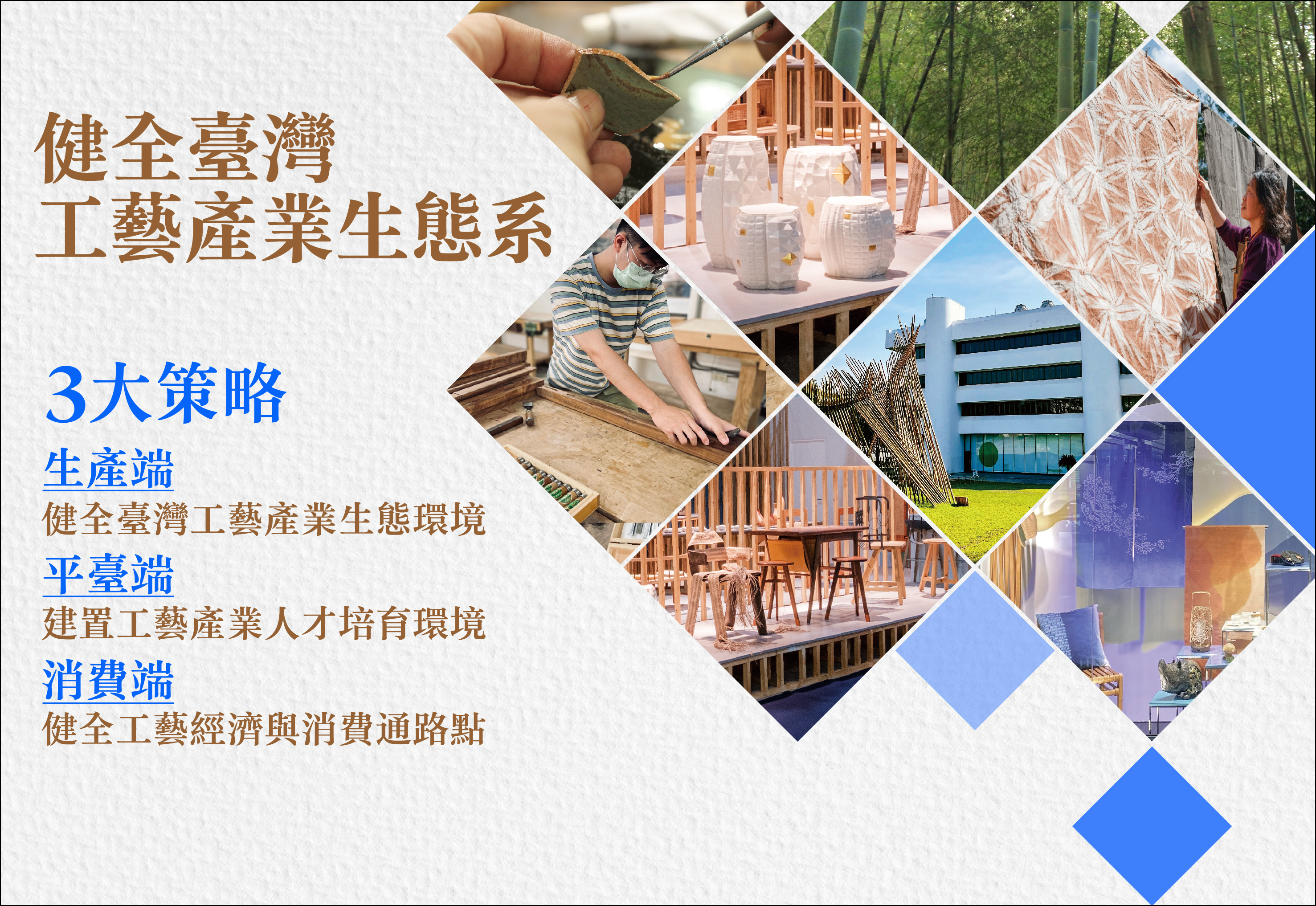 從生產端、平臺端至消費端(包含材料、人才、研發生產、通路市場等環節),透過跨域、跨業、跨部門之互助分工,改善整體工藝產業環境,健全工藝產業生態系。