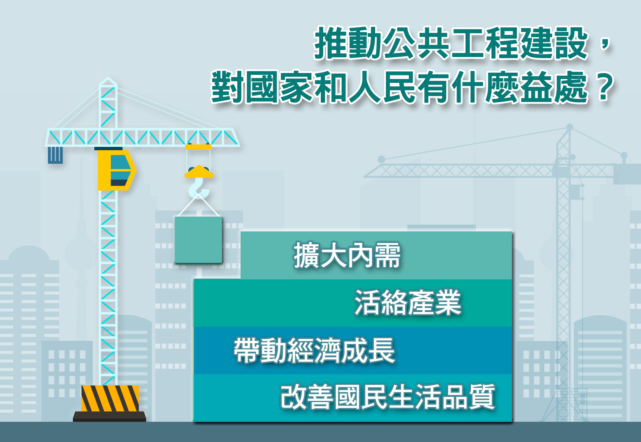 有效執行公共建設,不但帶動內需市場與產業發展,對台灣整體經濟持續成長至關重要。未來政府將透過加強前瞻基礎建設計畫等各項公共建設的推動,力求短期達到改善投資環境,促進就業並強化經濟成長動能之目的,長期則發揮厚植國家發展潛能、均衡區域發展,以及提升生活品質的效益。