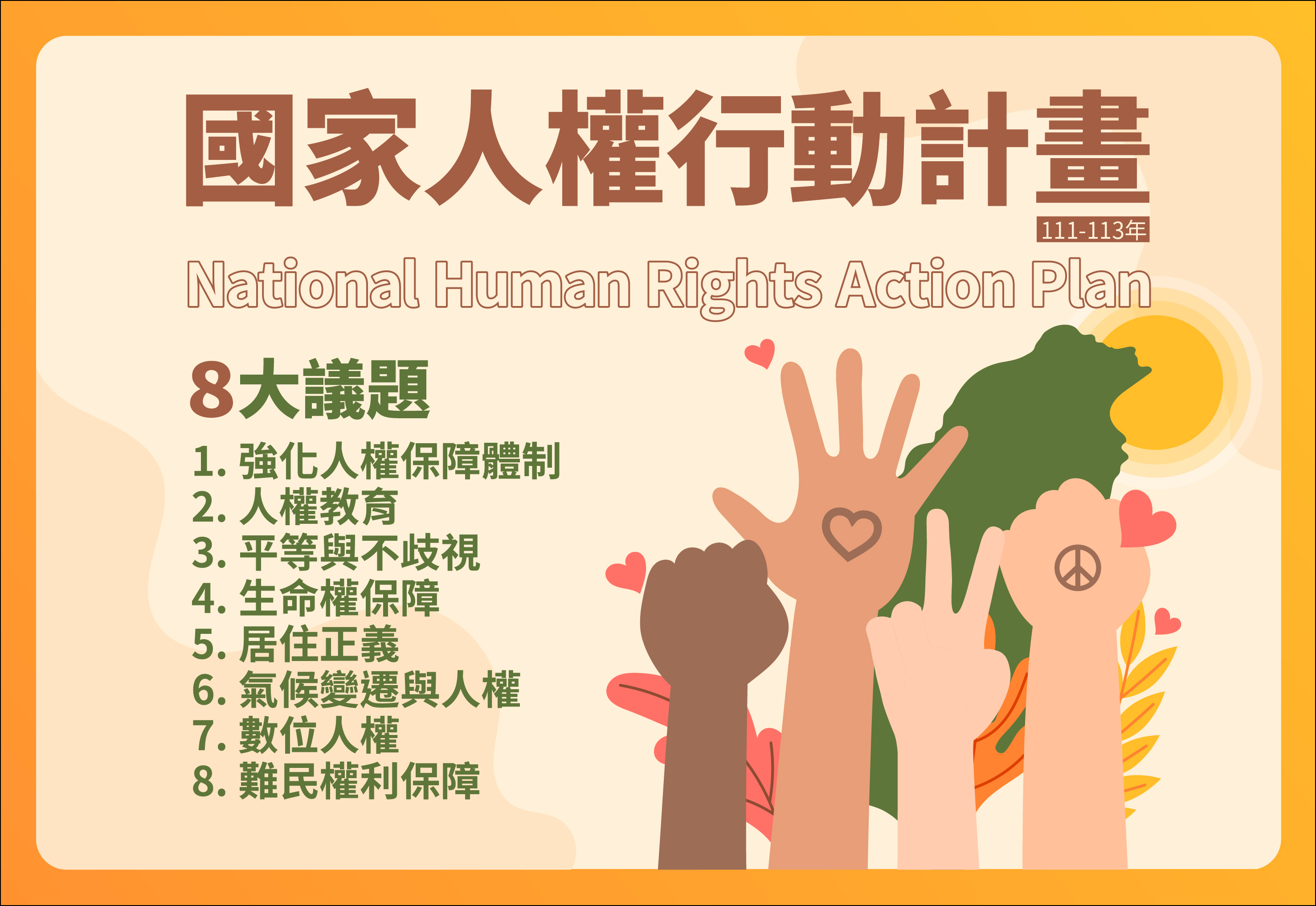 此外,為建立整體人權政策,完善人權保障,更於111年5月5日提出我國首部「國家人權行動計畫」(111-113年),特別關注原住民族、LGBTI(女同性戀者、男同性戀者、雙性戀者、跨性別者與雙性者)、遊民、外籍移工、老人、婦女、兒童、身心障礙者、難民等不利處境的群體,包含8大人權議題、154項行動方案,承諾將人權保障列入國家整體發展及相關政府施政計畫中,並將政府資源有效運用於人權保障事務,代表政府不僅願意承諾並自主履行國際人權公約的義務,亦符合聯合國鼓勵各會員國制定行動計畫的國際人權保障思潮,讓臺灣的人權標準不斷向上提升。
