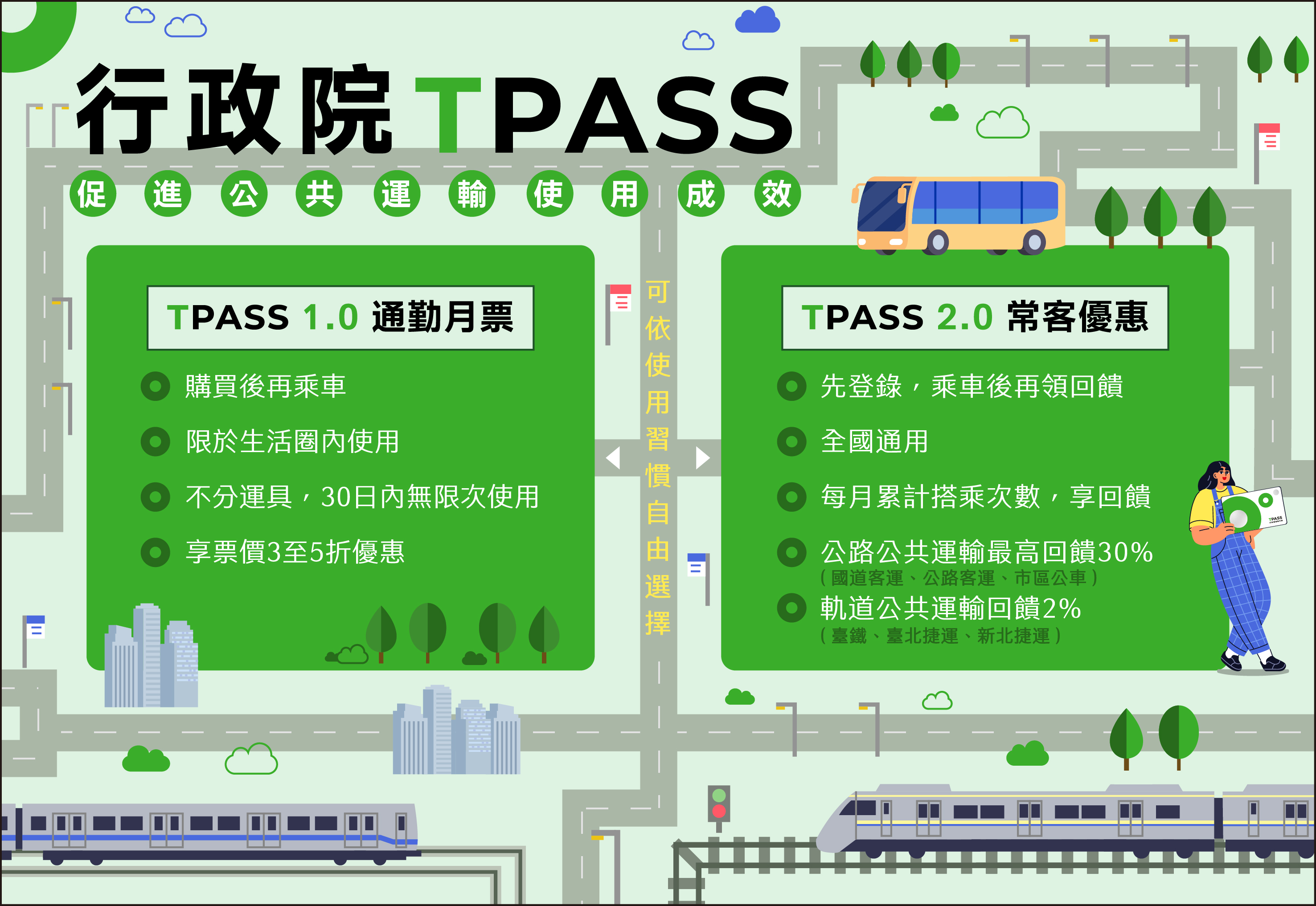 由中央盤點全國各縣市旅運型態及公共運具條件,協助地方政府規劃通勤月票,結合中央、地方資源共同推廣使用,提供多個跨縣市生活圈,不限次數搭乘捷運、公車、臺鐵等交通工具的優惠月票方案(簡稱TPASS 1.0)。TPASS 2.0係屬常客優惠,民眾只要持記名電子票證且至公路局公共運輸常客優惠回饋專區完成登錄,每月搭乘公共運輸達11次以上,可享不同比例乘車金額回饋,臺鐵和捷運也有加碼。