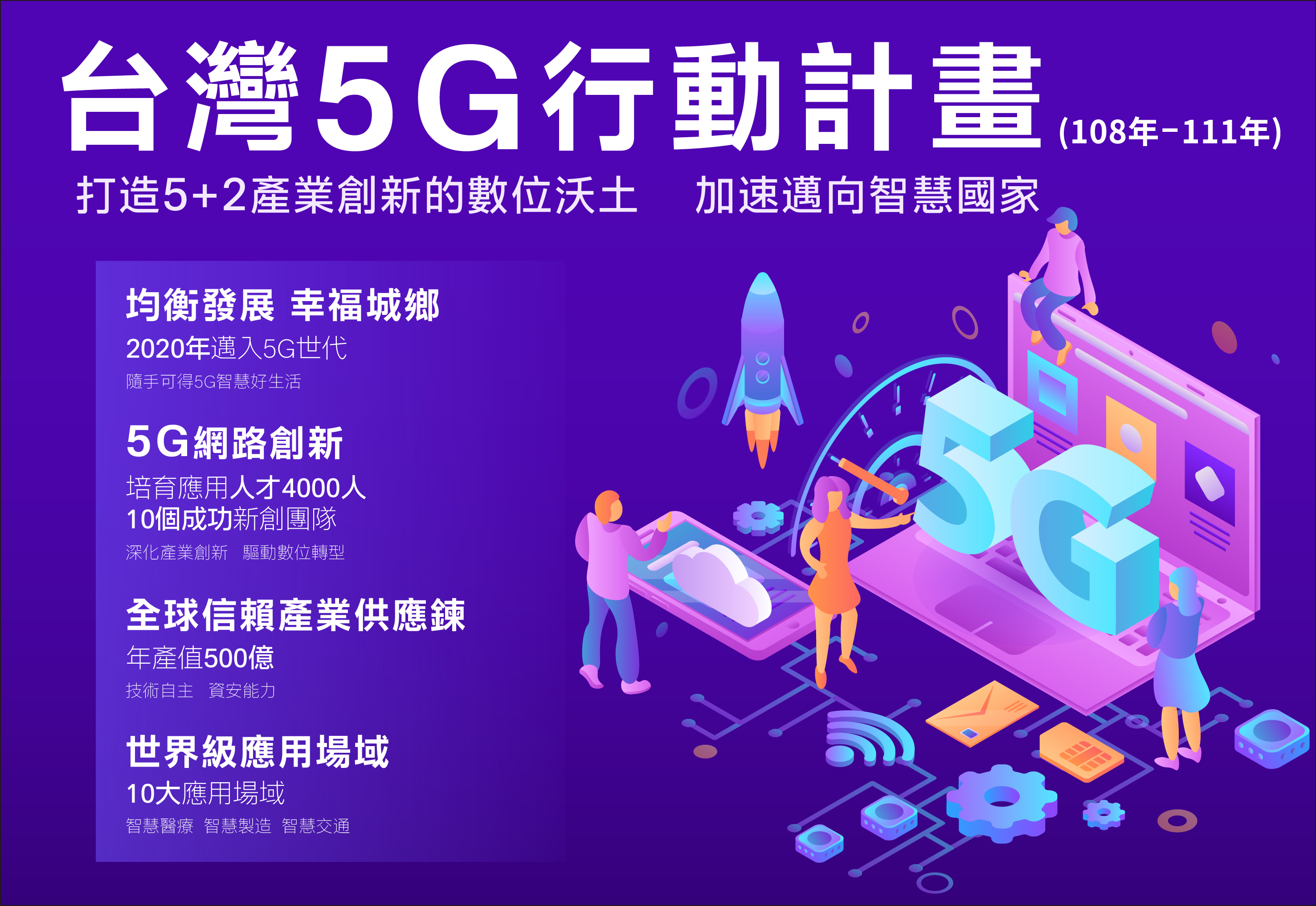為掌握5G蓬勃發展,以及帶來龐大商機的契機,行政院於108年5月10日核定「台灣5G行動計畫」(108年至111年),預計4年投入204.66億元,以鬆綁、創新、實證、鏈結等策略,全力發展各式5G電信加值服務及垂直應用服務,打造台灣為適合5G創新運用發展的環境,藉以提升數位競爭力、深化產業創新,實現智慧生活。