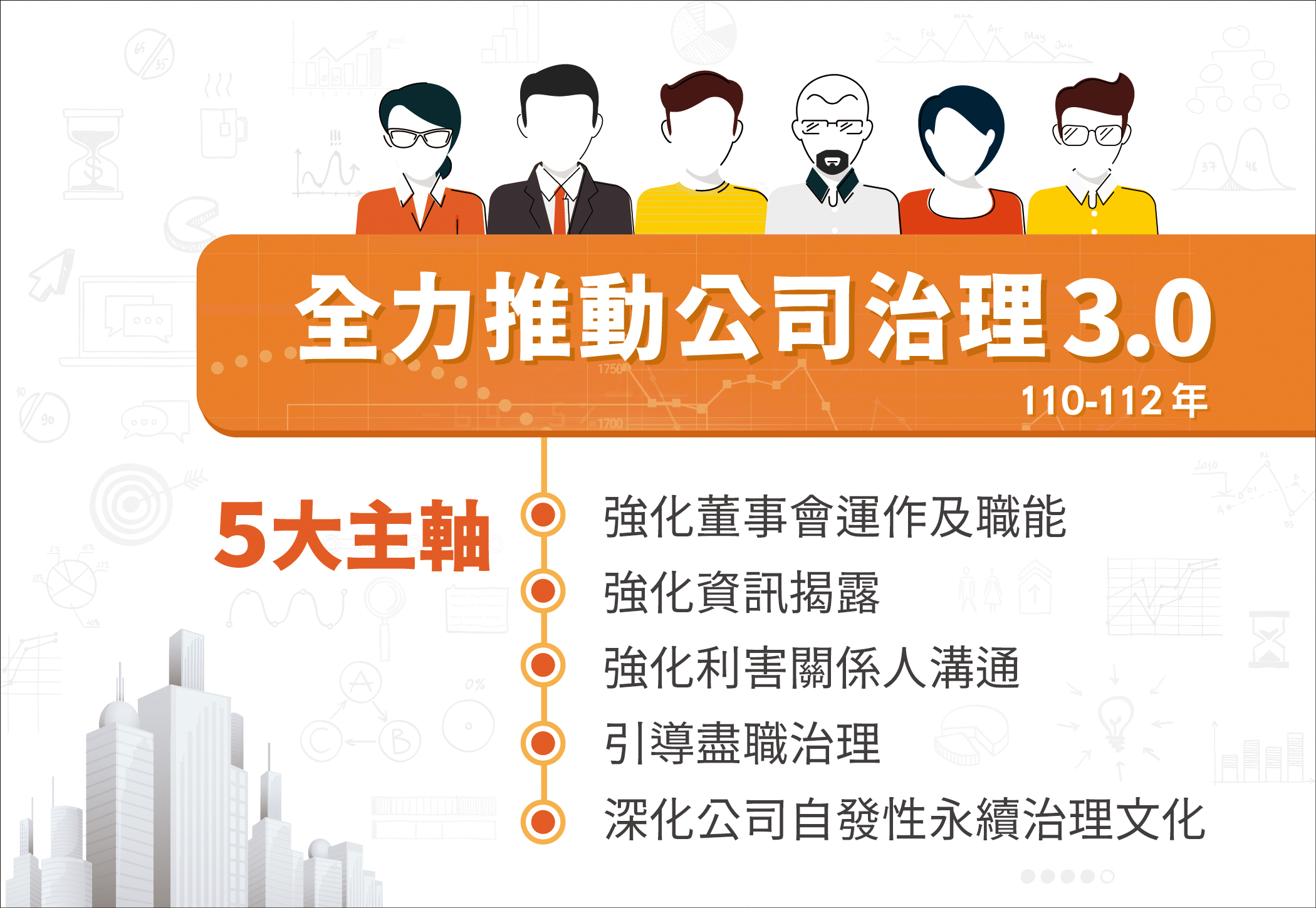 為因應資本市場環境快速變遷、加速精進我國公司治理,並掌握全球重視的ESG(環境、社會與公司治理)趨勢,金管會啟動新一期的「公司治理3.0—永續發展藍圖」(110-112年)3年計畫,將透過5大主軸、共39項具體措施,期帶動企業落實公司治理,提升永續發展,並引導投資人及相關利害關係人良性發展與互動,營造健全ESG永續發展的生態體系,提升我國資本市場國際競爭力。