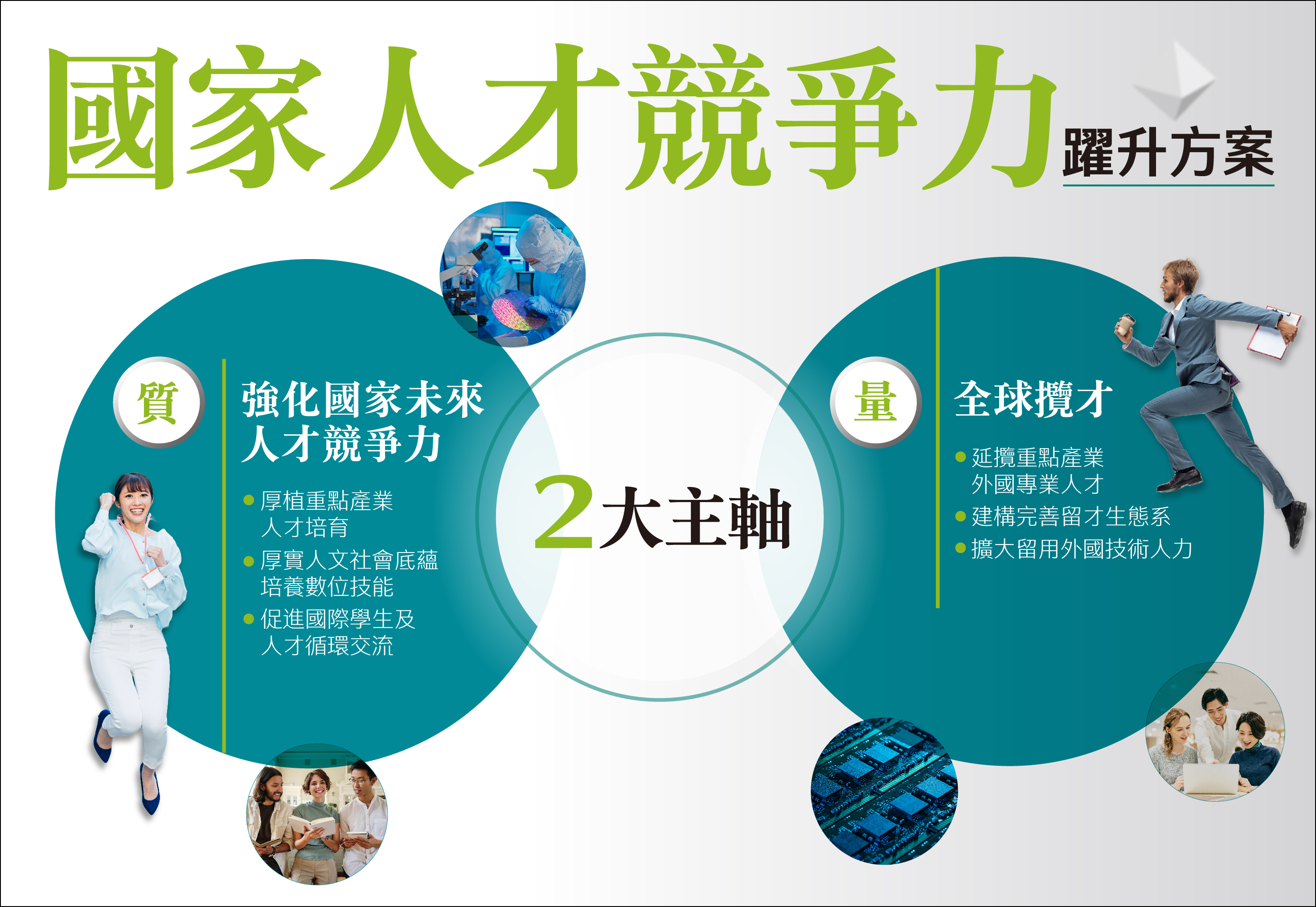 為因應未來數位科技及淨零轉型,落實國家希望工程的「投資人才」政策,行政院於113年9月通過「國家人才競爭力躍升方案」,透過「強化國家未來人才競爭力」及「全球攬才」兩大主軸,進一步加強育才、攬才及留才力道,目標為至117年累計培育AI、綠領及跨域人文數位人才45萬人次,並新增12萬名外國專業人才及8萬名外國技術人力,期充裕下一階段國家發展所需人才,實現創新繁榮臺灣的願景。(註:綠領人才係指從事綠色工作的專業人員,廣義來說各產業和職業中,舉凡擁有環境永續和綠色經濟相應技能者,皆可稱之)