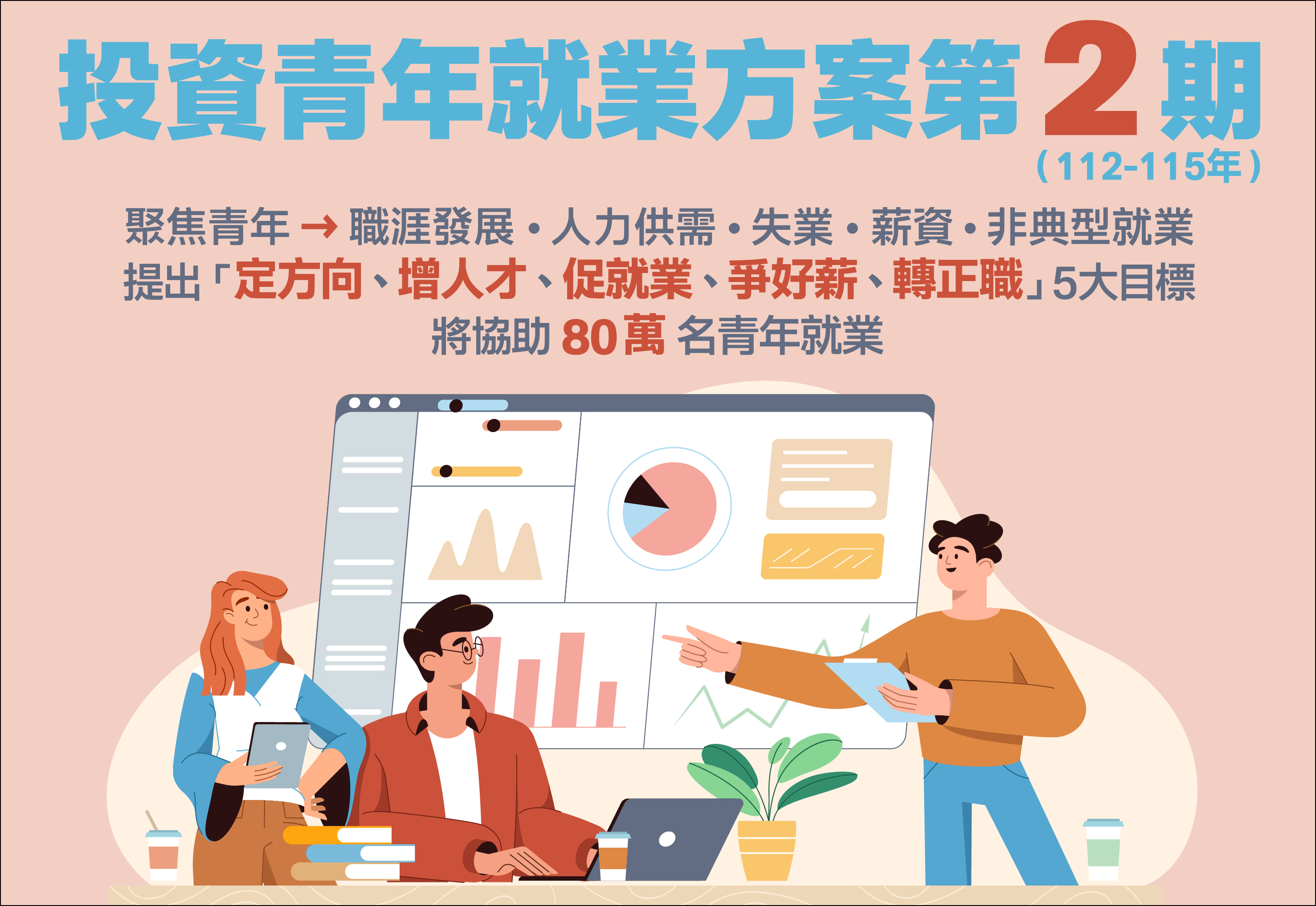 惟我國目前青年失業率仍為整體國人2倍以上,15-24歲人口勞參率亦低於OECD(經濟合作暨發展組織)國家平均達10個百分點,為因應未來產業發展趨勢及青年面對的就業情勢,勞動部於112年5月再啟動「投資青年就業方案第二期(112-115年)」,統合11個部會資源,聚焦「職涯發展」、「人力供需」、「青年失業」、「青年薪資」及「非典型就業」等核心議題,提出5大目標、12項策略、48項措施,預計投入160億元,協助80萬名青年就業。