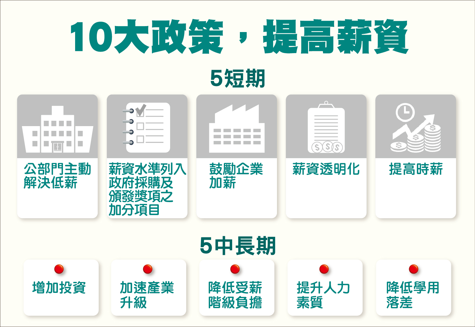 鑑於拼經濟之目的在提高人民所得,加上蔡英文總統亦揭示將全力改善國內薪酬待遇,行政院除先前已推動的調高基本工資、對公教人員加薪、鼓勵企業加薪、調高個人所得稅相關扣除額外,亦於107年5月14日再提出,屬短期措施的「提高低薪族薪資之行動方案」和中、長期的「提高全民薪資行動方案」,共10大因應政策。期透過整體性規劃,能有效提升國內薪資水準,使勞資雙方共享經濟成長的果實,邁向符合「創新、就業及分配」價值的經濟發展新模式。