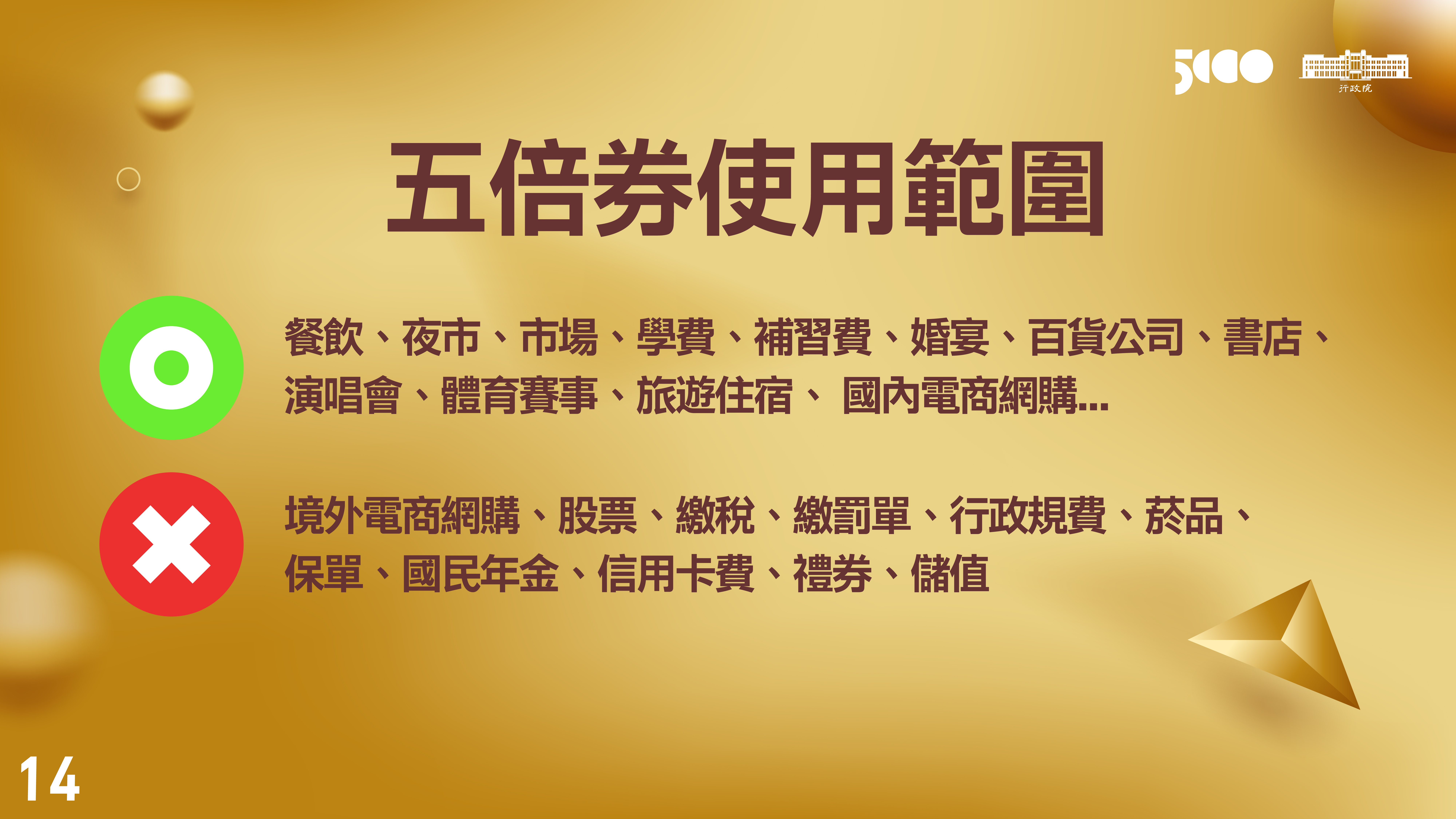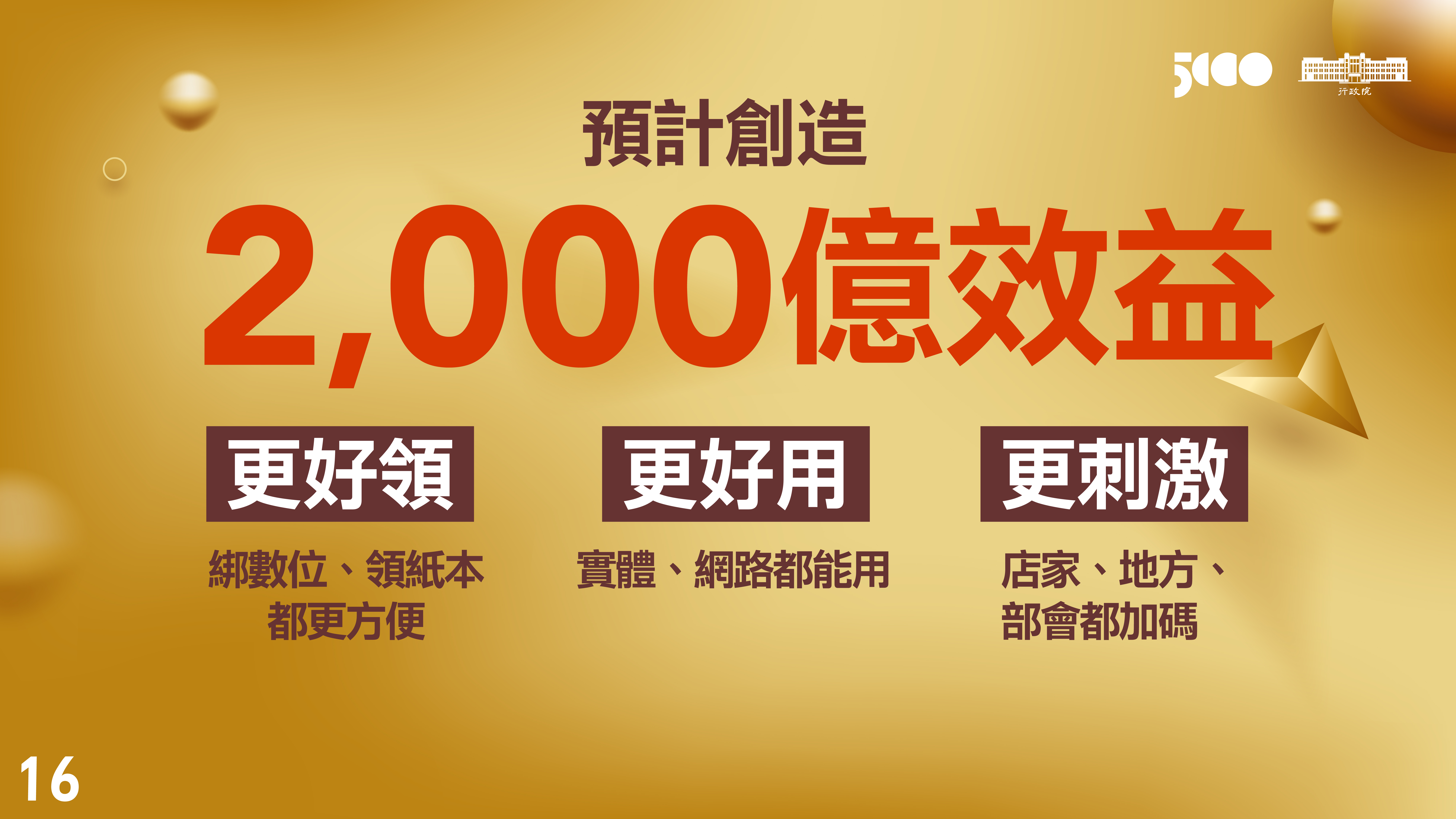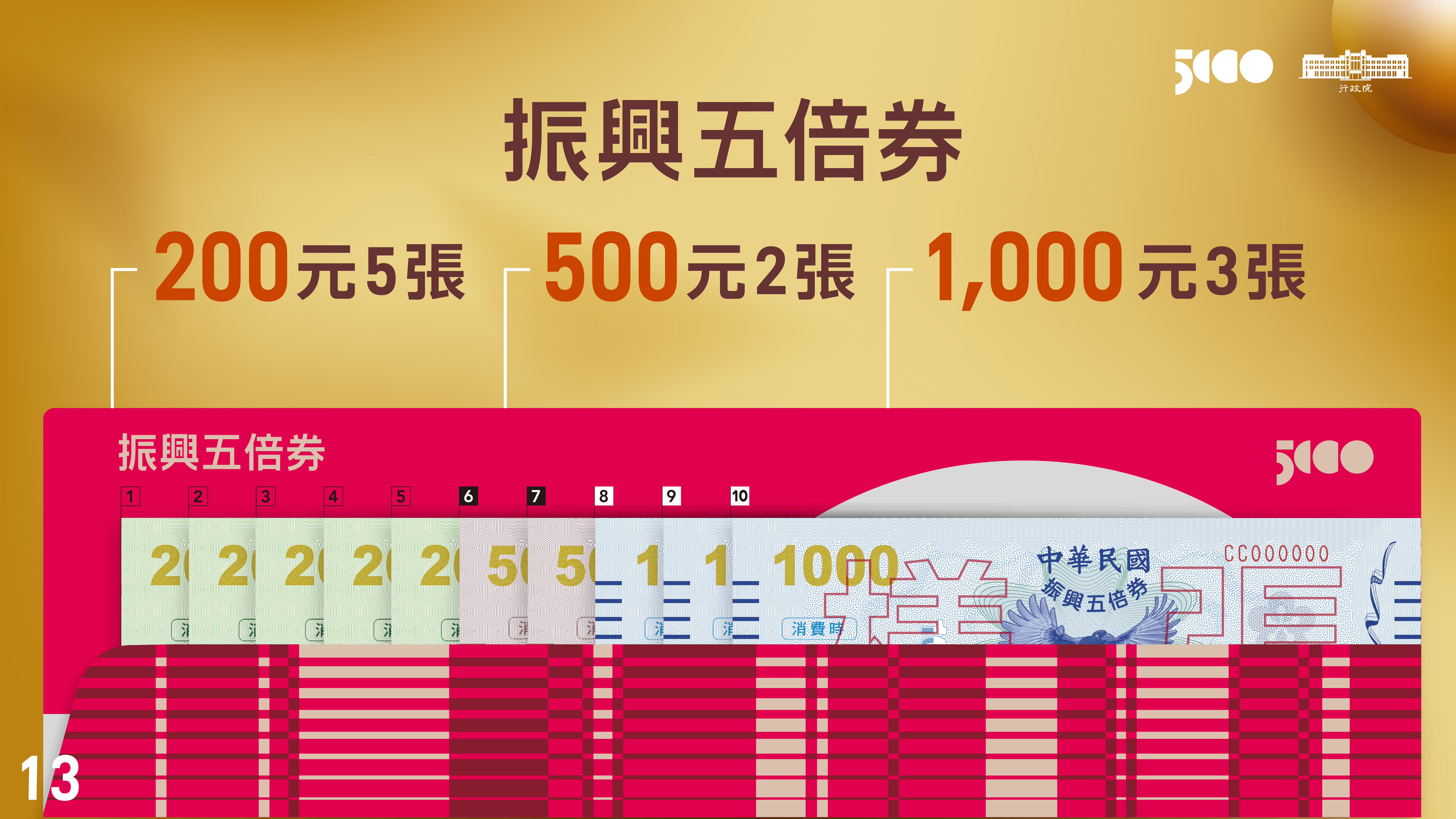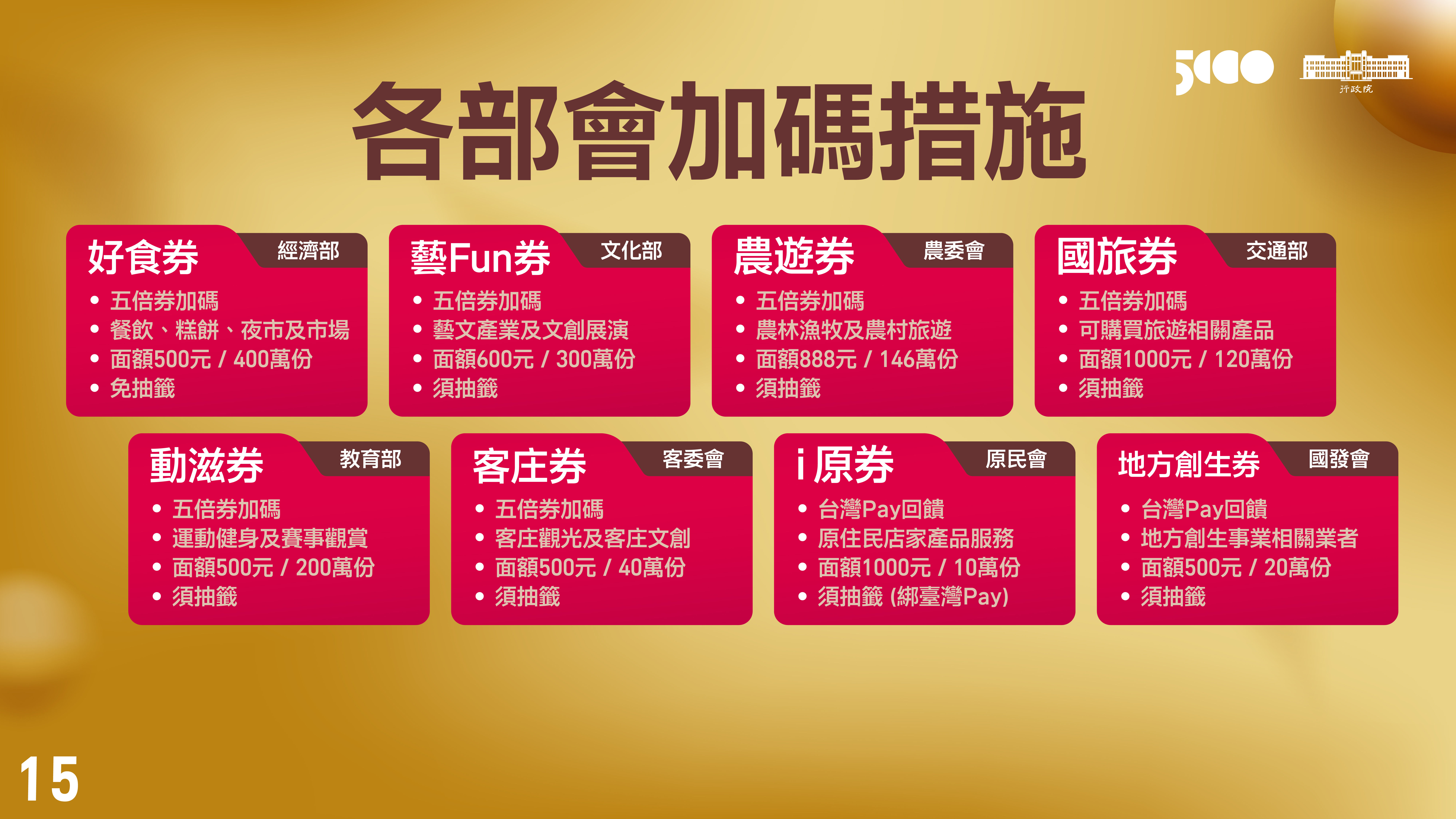 五倍券強化數位綁定,除開放「共同綁定」、「擴大支付工具」,針對小店家補助使用電子支付系統費用,也設計「識別標章」供店家辨識等,期達到更為「好領、好用、好刺激」的效果。另各部會也共襄盛舉加碼提供好食券、藝Fun券、農遊券、國旅券、動滋券、客庄券、i原券、地方創生券等8大振興券,期能再創更好成績並帶動臺灣整體經濟發展。
