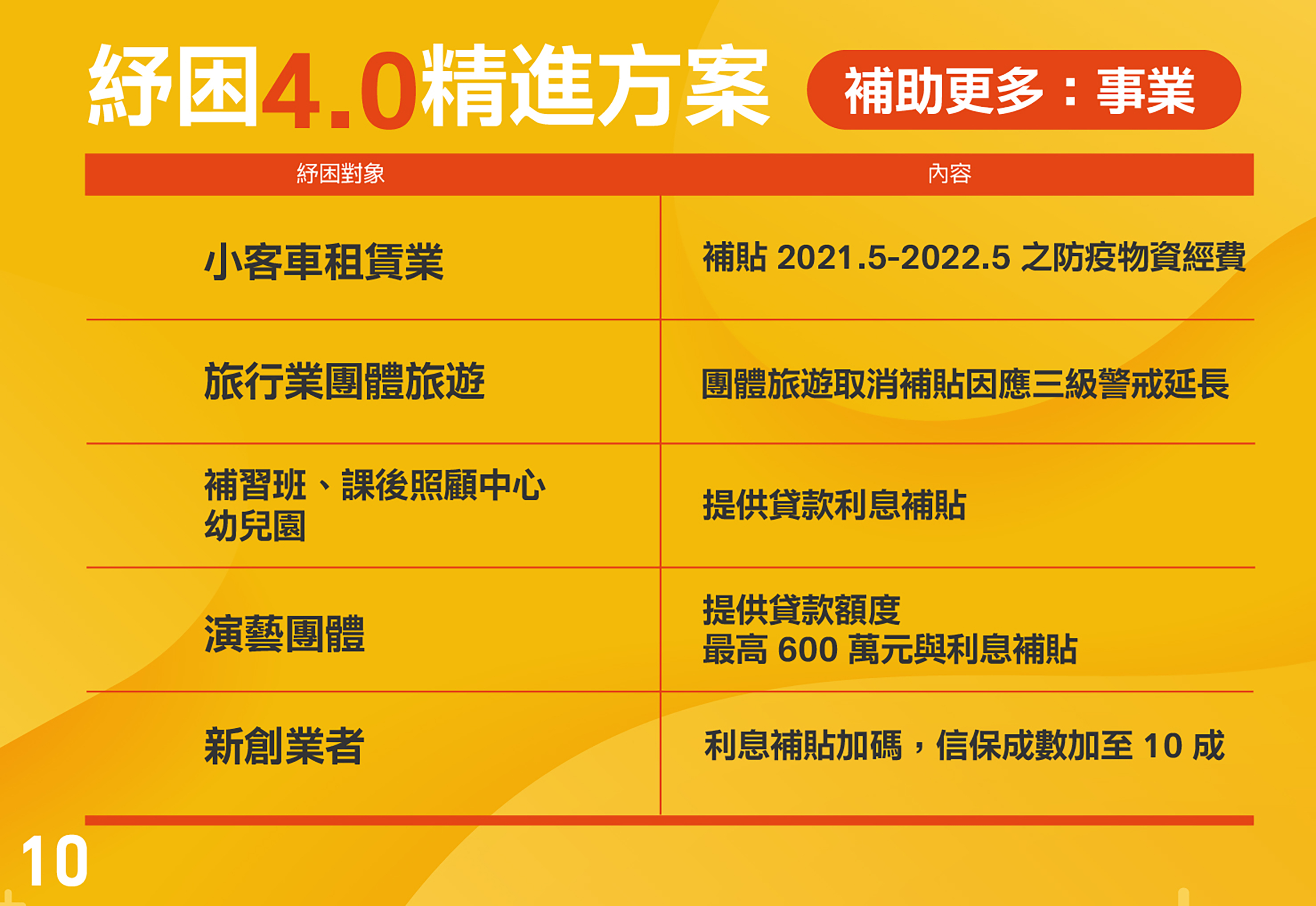 ■ 其他:加碼機場商業服務設施業基本維運費用補貼成數至4成、新增小客車租賃業之短租租賃車輛1年防疫物資補貼、延長對旅行業團體旅遊取消補貼期間等;對新創業者行業別認定彈性處理等。