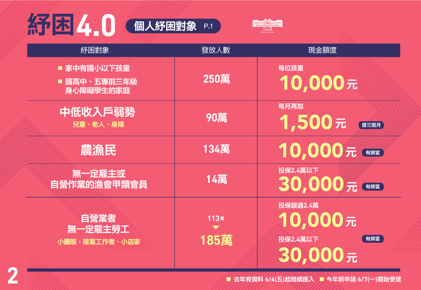 個人紓困現金去年有資料者自今年6月4日起直接匯入,新增個人紓困現金則自6月7日開始受理。