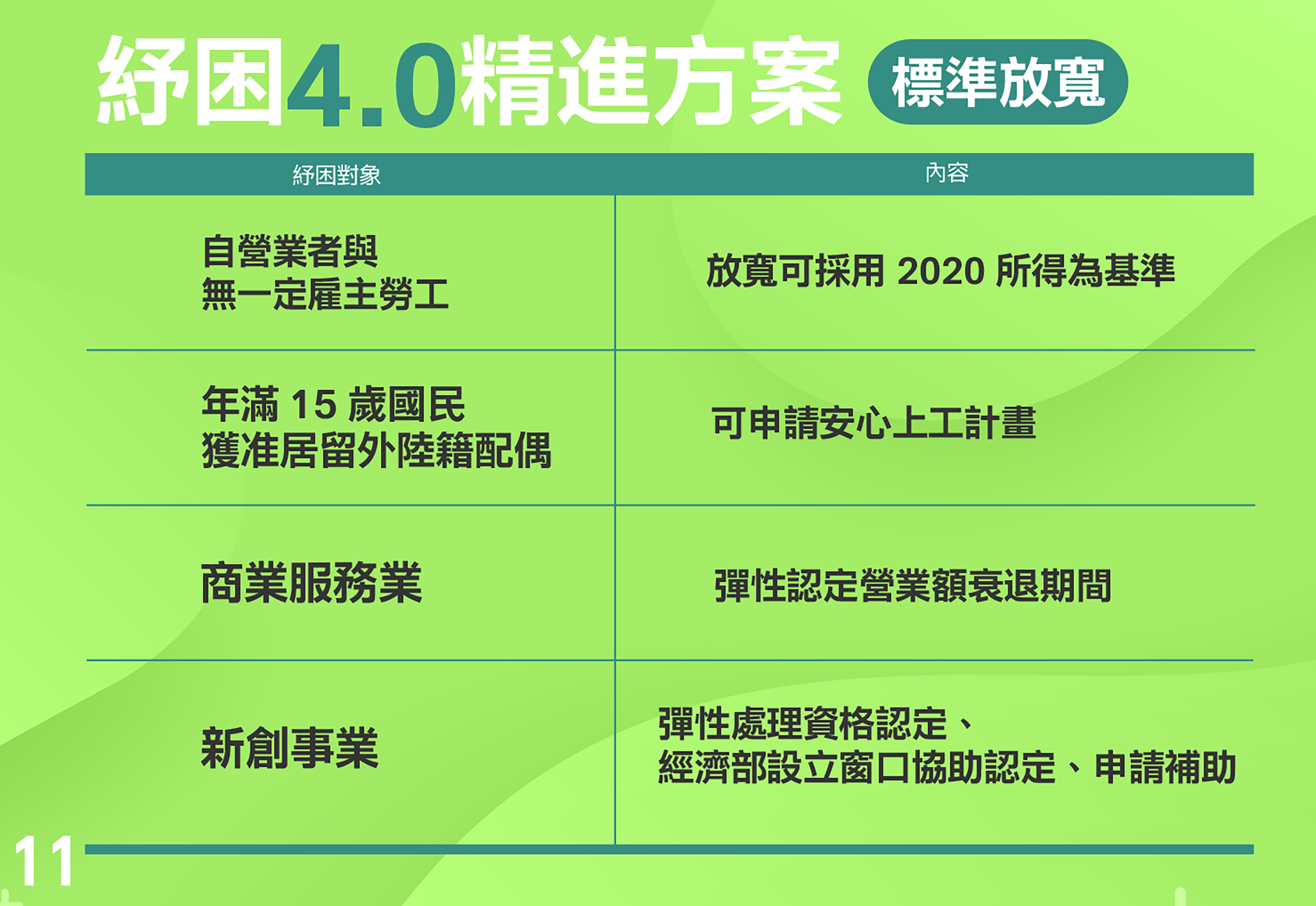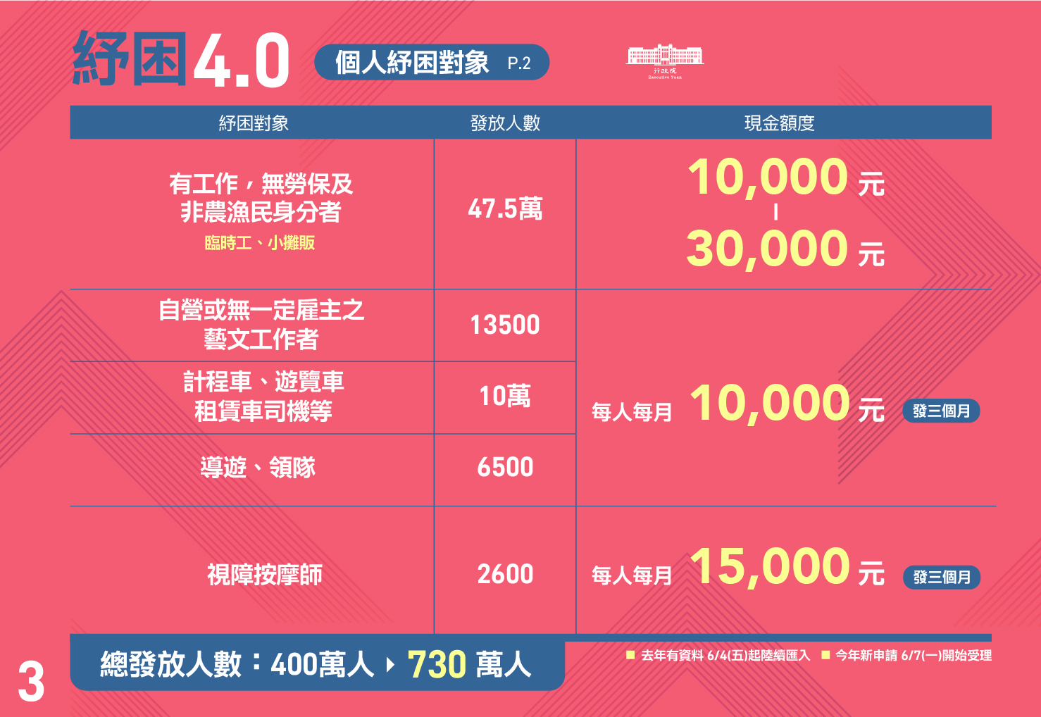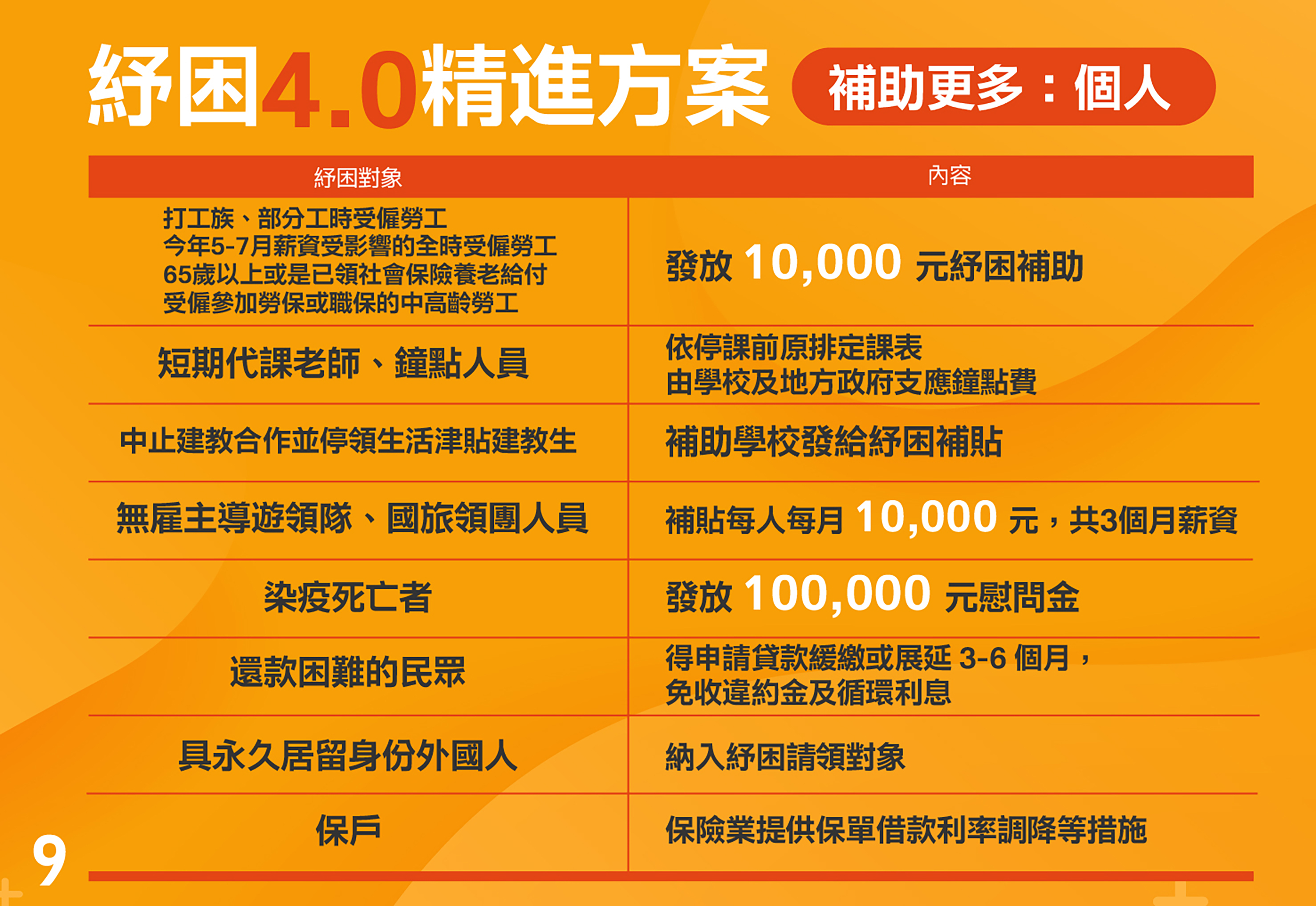 ■ 其他受紓困者:打工族、部分工時受僱勞工、110年5-7月薪資受影響的全時受僱勞工、65歲以上或是已領社會保險養老給付,受僱參加勞保或職保的中高齡勞工,每人補貼1萬元;短期代課老師、鐘點人員,依110年5月18日宣布停課前原已排定時數或班表,由學校及地方政府原編列之相關預算支應鐘點費;建教生中止在建教合作機構訓練並停領生活津貼,補助學校發給補貼;染疫死亡者,發放10萬元喪葬慰問金;還款困難的民眾,得申請貸款展延3-6個月,期間免收違約金及遲延利息;放寬年滿15歲以上國民或獲准居留的新住民,可申請安心即時上工計畫;在臺永久居留身分之外國人,亦納入紓困請領對象。