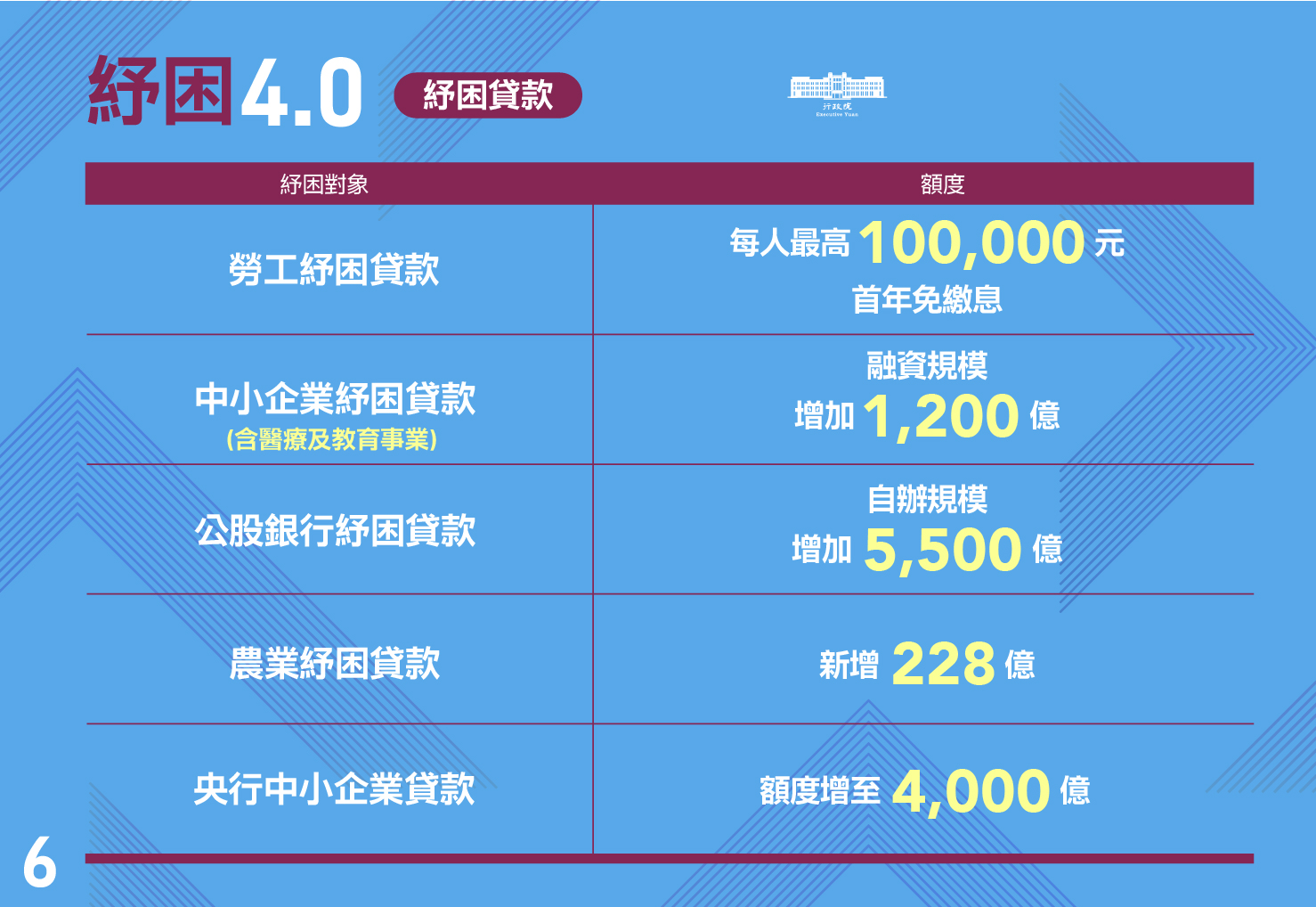 ■ 央行中小企業貸款:中小企業貸款專案融通額度從3千億元提高至4千億元,並延長企業申貸期限及放寬貸款申請條件,同時提高小規模營業人貸款方案每戶貸款最高額度至100萬元,協助支應企業的資金需求。