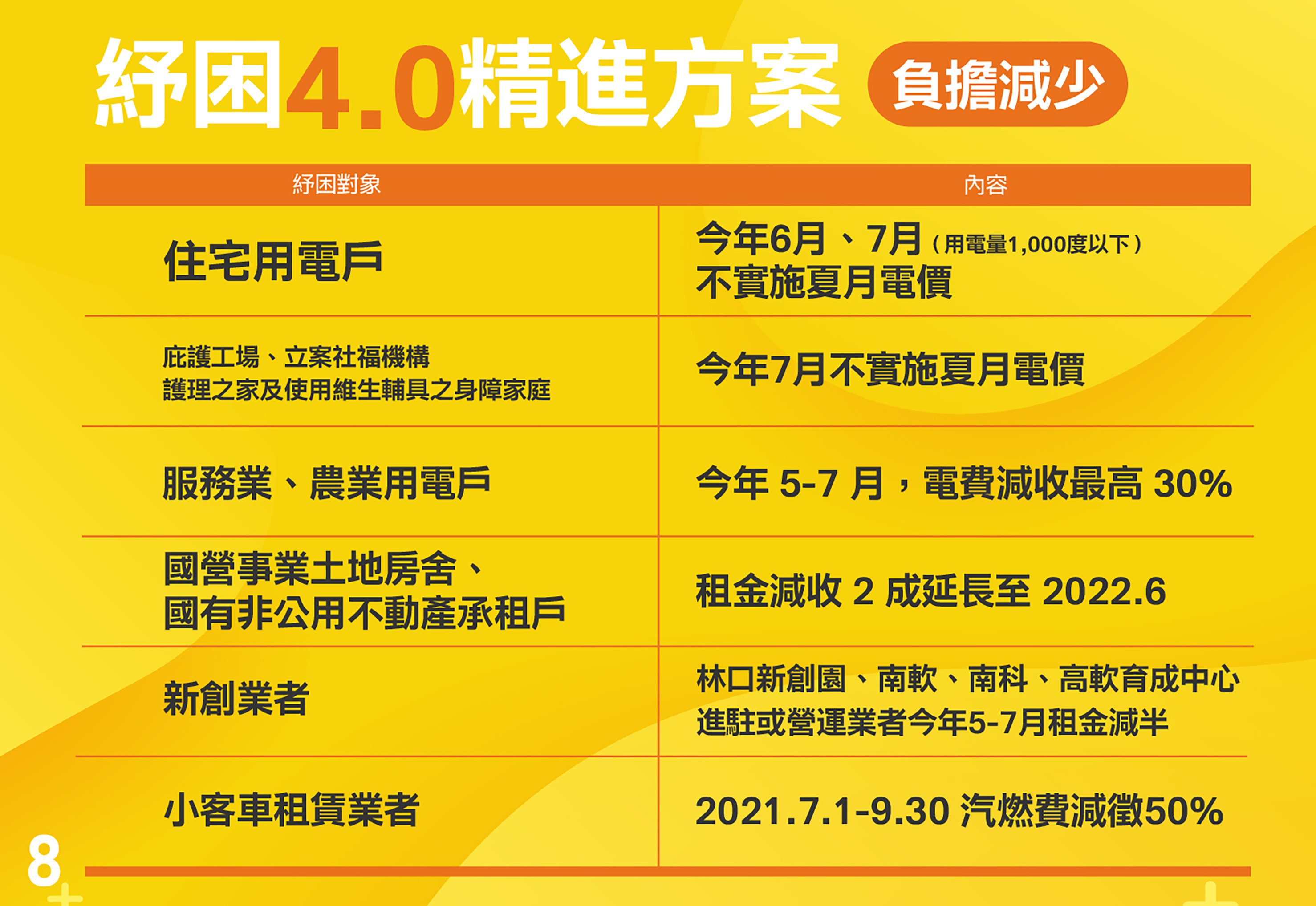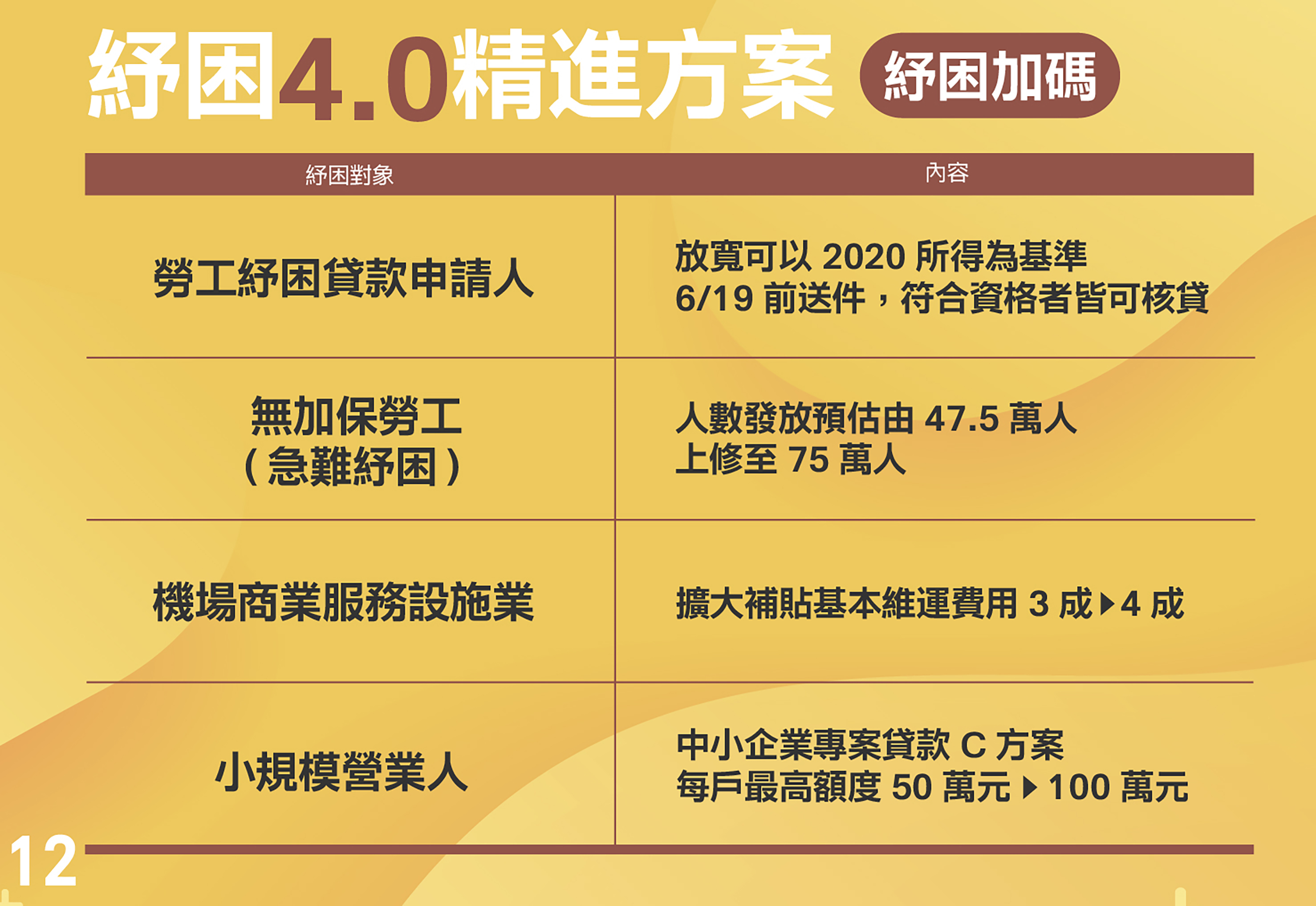 ■ 其他:提供保單借款優惠利率、新增協助新創紓困融資加碼方案、新增對私人或團體設立補習班、課後照顧中心及幼兒園紓困貸款利息補貼;新增演藝團體受疫情影響發生營運困難之紓困貸款等。