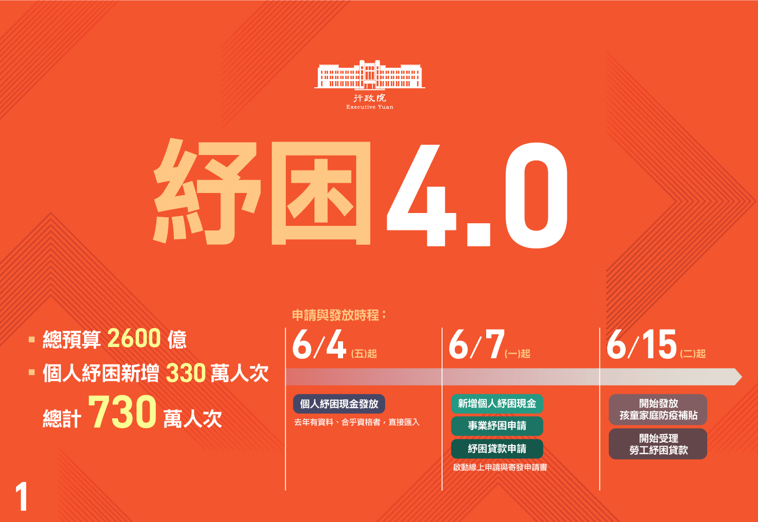 因應「COVID-19」(新冠肺炎)疫情,我國在去(109)年1月成立中央流行疫情指揮中心,2月公布《嚴重特殊傳染性肺炎防治及紓困振興特別條例》(下稱特別條例),行政院依特別條例原編列600億元,其後因全球疫情加劇,4月修正特別條例,追加特別預算至2,100億元, 7月再追加2,099億4,700萬元的預算,除用於防疫外,並特別對受疫情衝擊的勞工、產業與企業,從「發現金、助貸款、減負擔」3個面向,擴大紓困對象、簡化申請程序,紓困1.0-3.0迄今(110)年9月15日止,已發放1,465.3億元現金、嘉惠527.5萬人,總計紓困逾1,375萬的個人及企業。