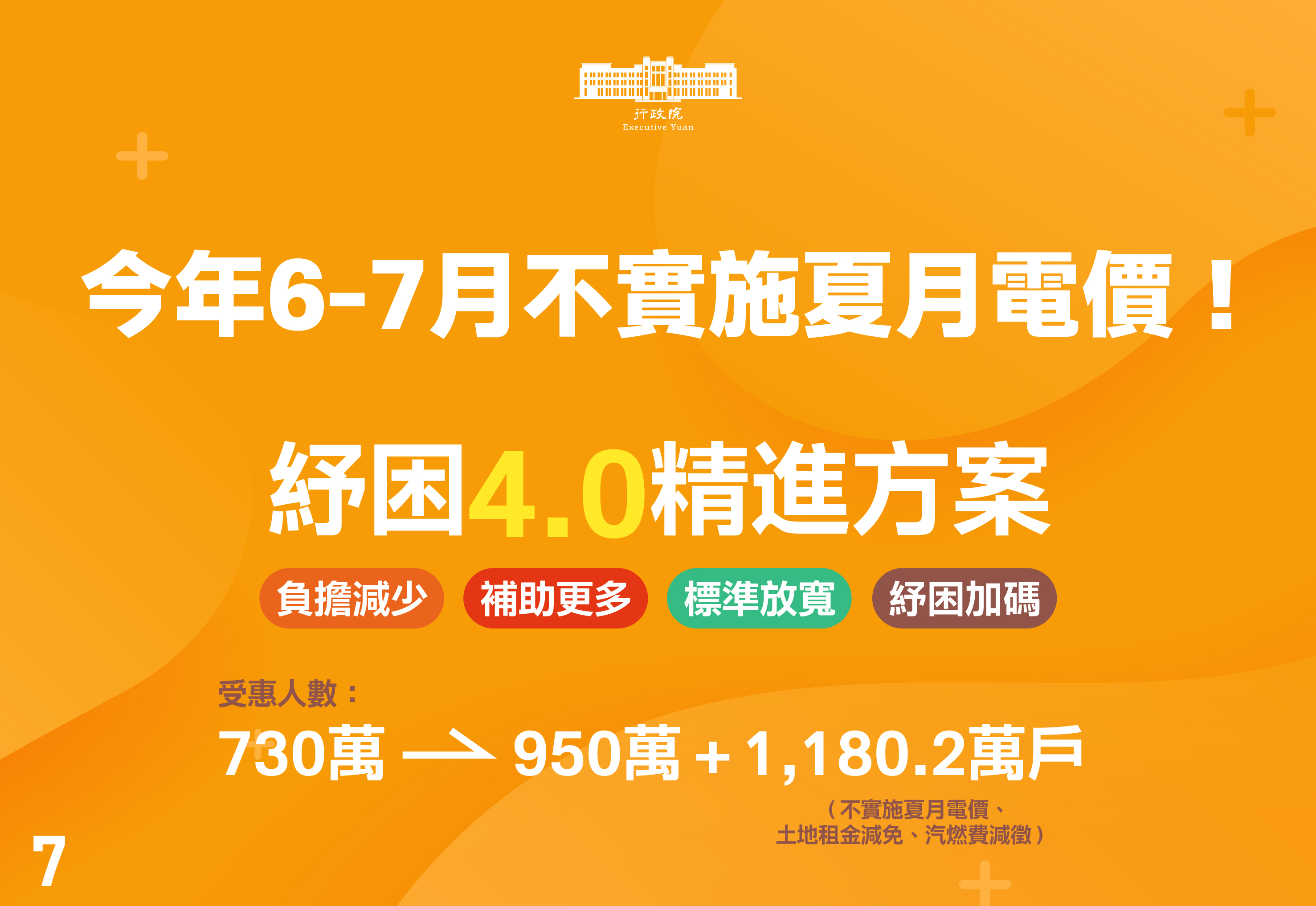 ■ 減電費:住宅用電戶,今(110)年6月不實施夏月電價,7月1,000度以下的用電量,不實施夏月電價,在合理範圍內達成減負擔、促節電的雙重目標,約1,000萬用戶受惠。另為照顧弱勢,庇護工場、立案社福機構、護理之家及使用維生輔具之身障家庭計1.3萬戶,7月全部用電皆不實施夏月電價;服務業、農業用電戶,依營業額減少幅度給予電費減免,5至7月電費減收最高30%。