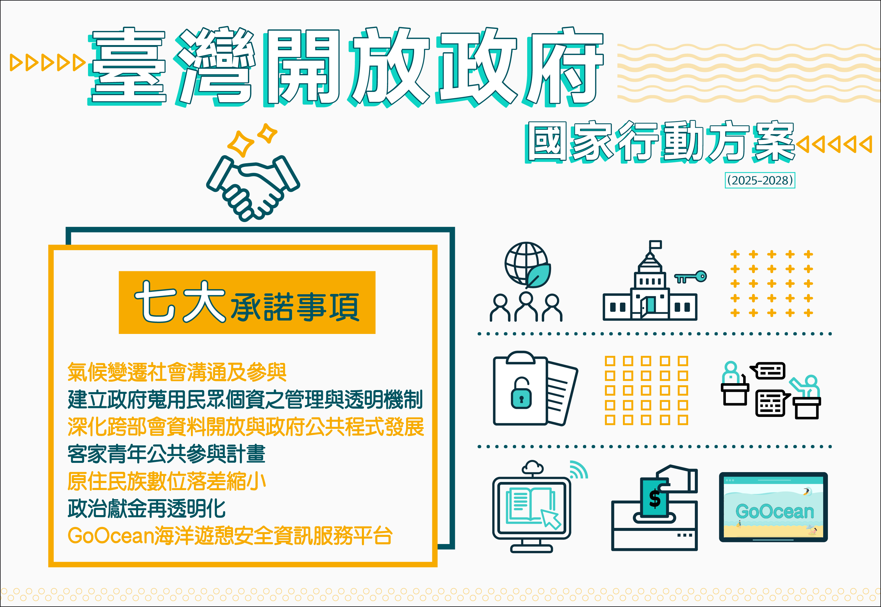 我國於2021年啟動首部「臺灣開放政府國家行動方案」(2021-2024),至今已奠定相當基礎並獲得成果。為持續深化民主素養,讓臺灣成為國際社會的可靠夥伴,再發布新一階段行動方案(2025-2028),透過公私協力機制,進一步聚焦於環境與氣候、數位治理、涵容、反貪腐及資訊近用等五大挑戰領域,並提出七大承諾事項,以因應全球趨勢與國內需求,強化數位技術應用、擴大多元公民參與機會,並深化政策透明度。
