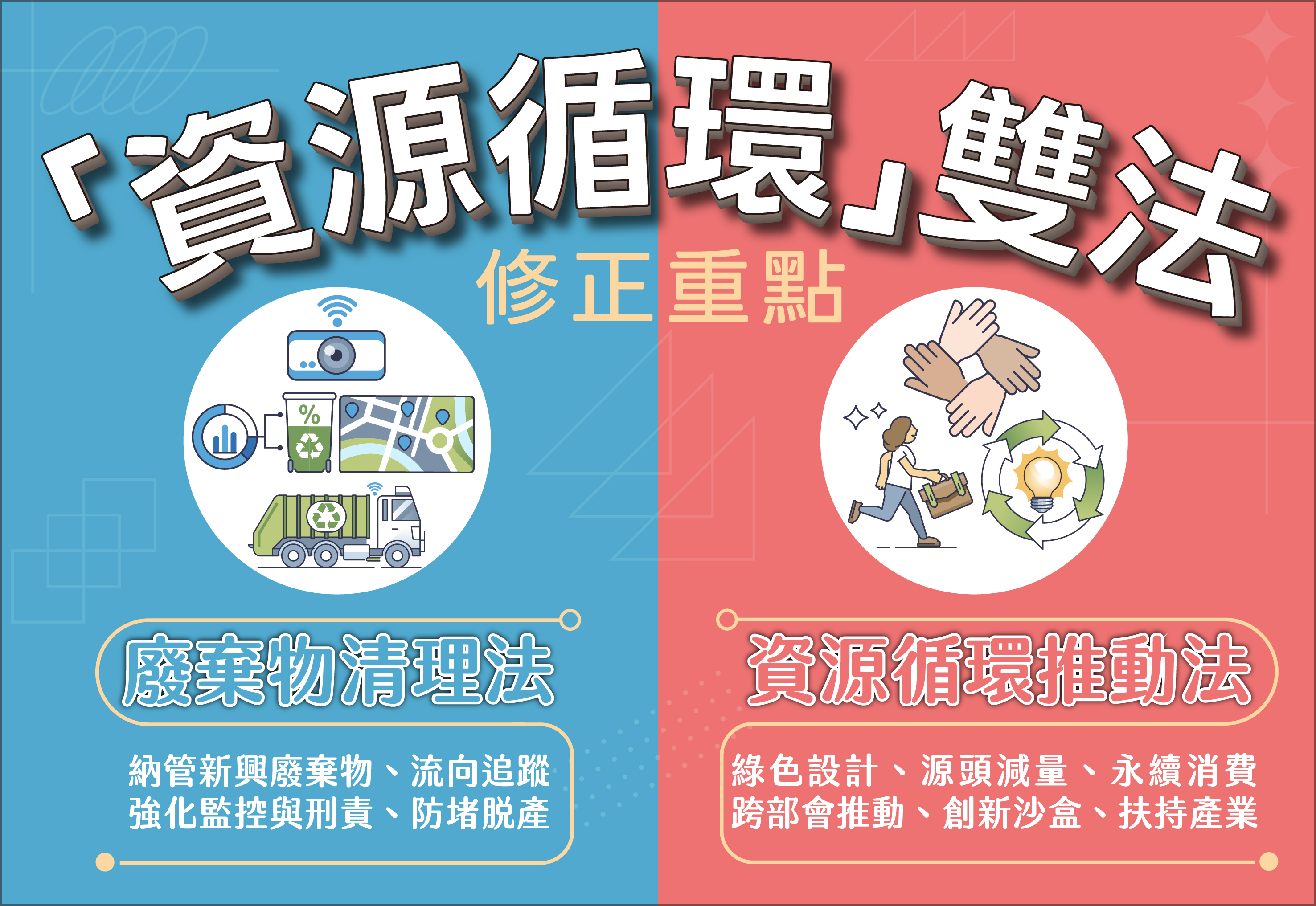 為因應日益嚴重的非法棄置、資源耗竭及國際綠色供應鏈標準的挑戰,行政院於115年4月9日通過《廢棄物清理法》及《資源回收再利用法》(更名為《資源循環推動法》)兩修正草案,以「源頭減量、資源循環、流向管控及環境正義」為核心,透過《廢棄物清理法》強化管制與嚴懲不法,並藉由《資源循環推動法》扶植產業創新與循環設計,引導臺灣由線性經濟全面轉向循環經濟模式,邁向2050淨零排放與「零廢棄」願景。