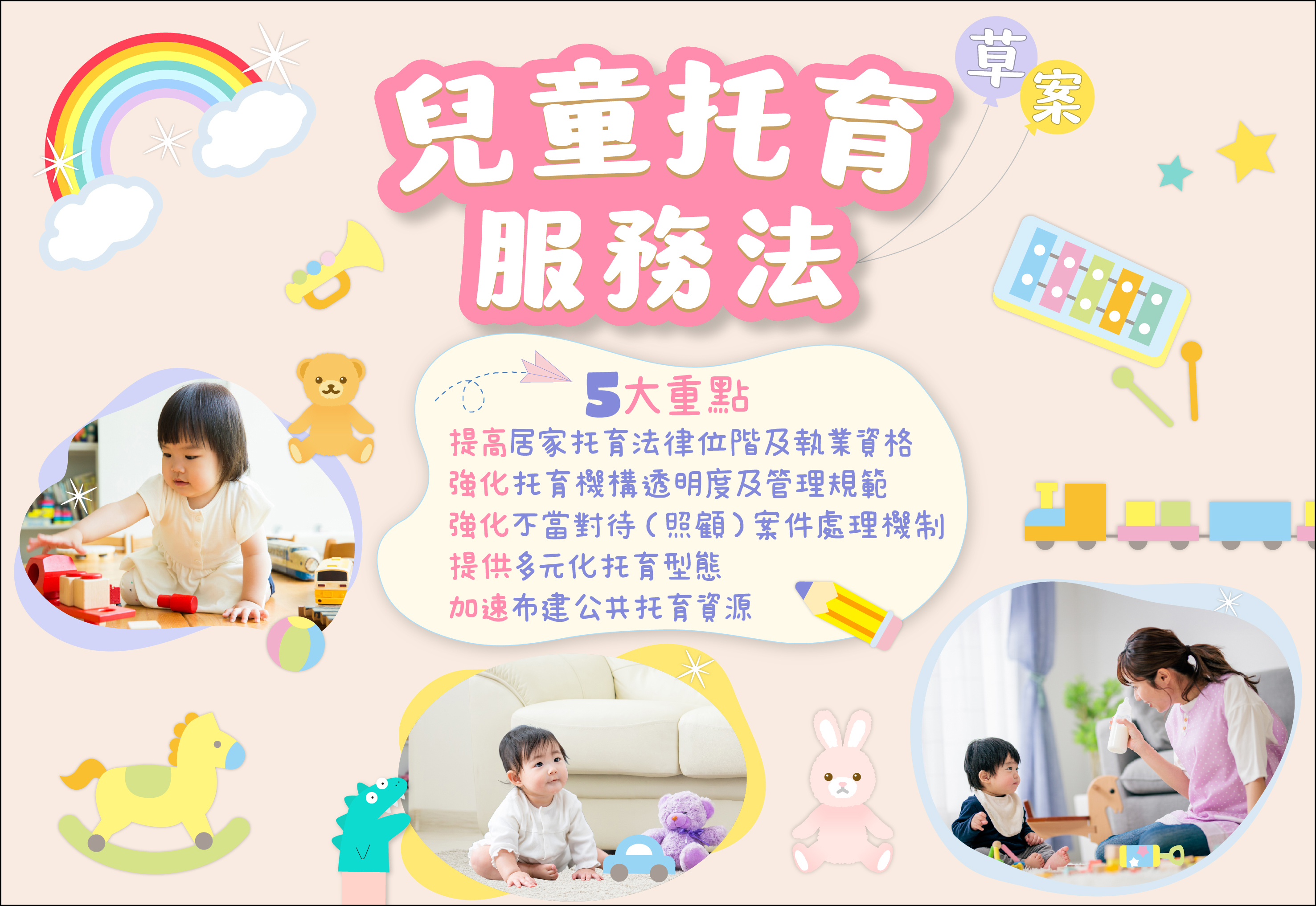 除推動育兒公共化政策外,因家長多元就業型態期待更具彈性之托育服務模式,並保障兒童接受適齡適性之保育照顧,行政院於114年5月8日通過《兒童托育服務法》草案,希望藉此完備0-2歲托育服務體系的管理與輔導機制,建構完善的照顧環境並提升服務品質,確保受托兒童及家長權益。