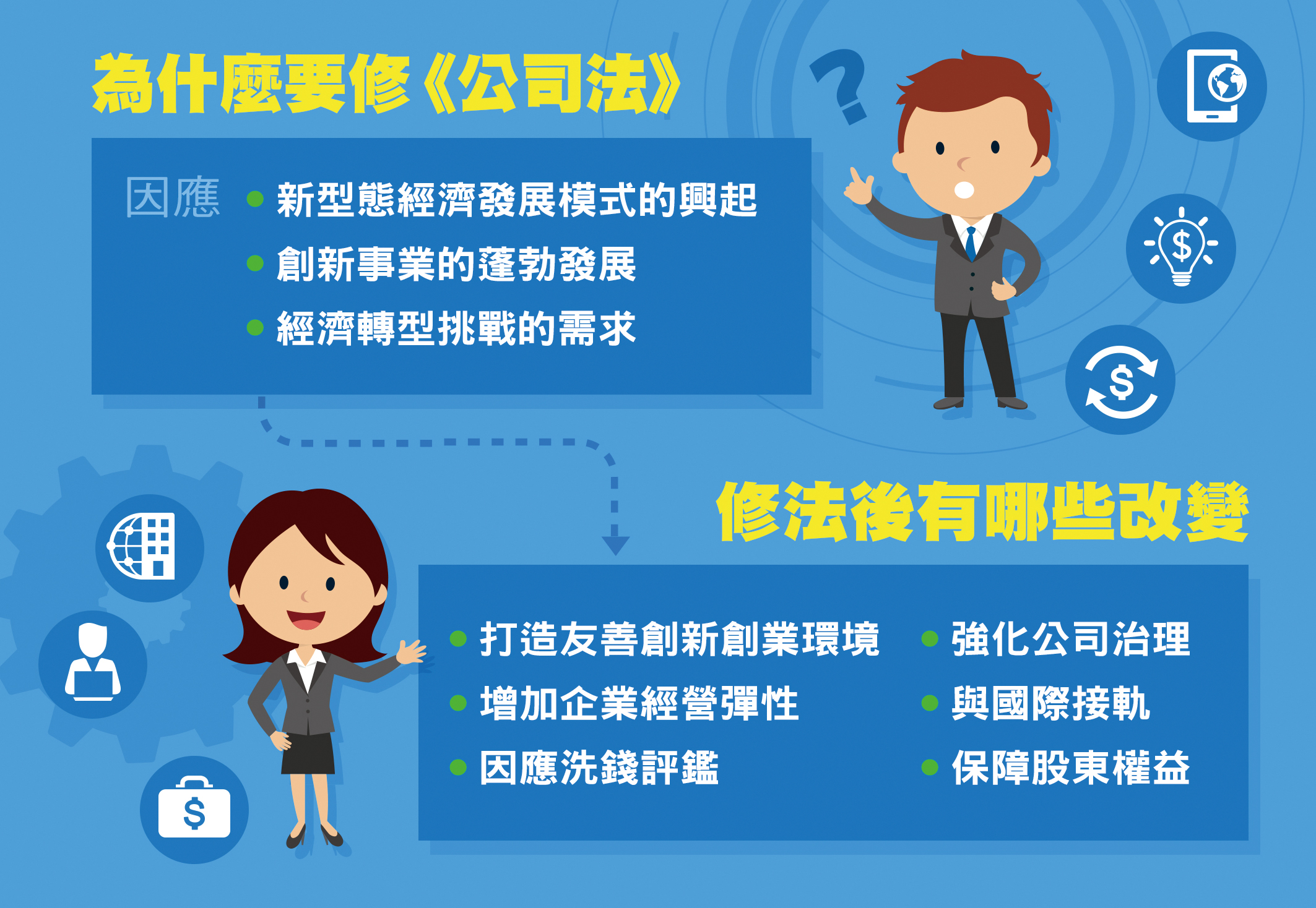 此次《公司法》修法,是希望在不大幅增加企業法令遵循成本下,建立更健全的公司體制,持續提供友善創新、創業環境,及適合全球投資之環境,以促使我國商業環境能更有利於各種產業發展,吸引更多國內外創業者在我國設立公司;同時將引領企業除追求本身利益外,亦能善盡社會責任,共創台灣美好未來。