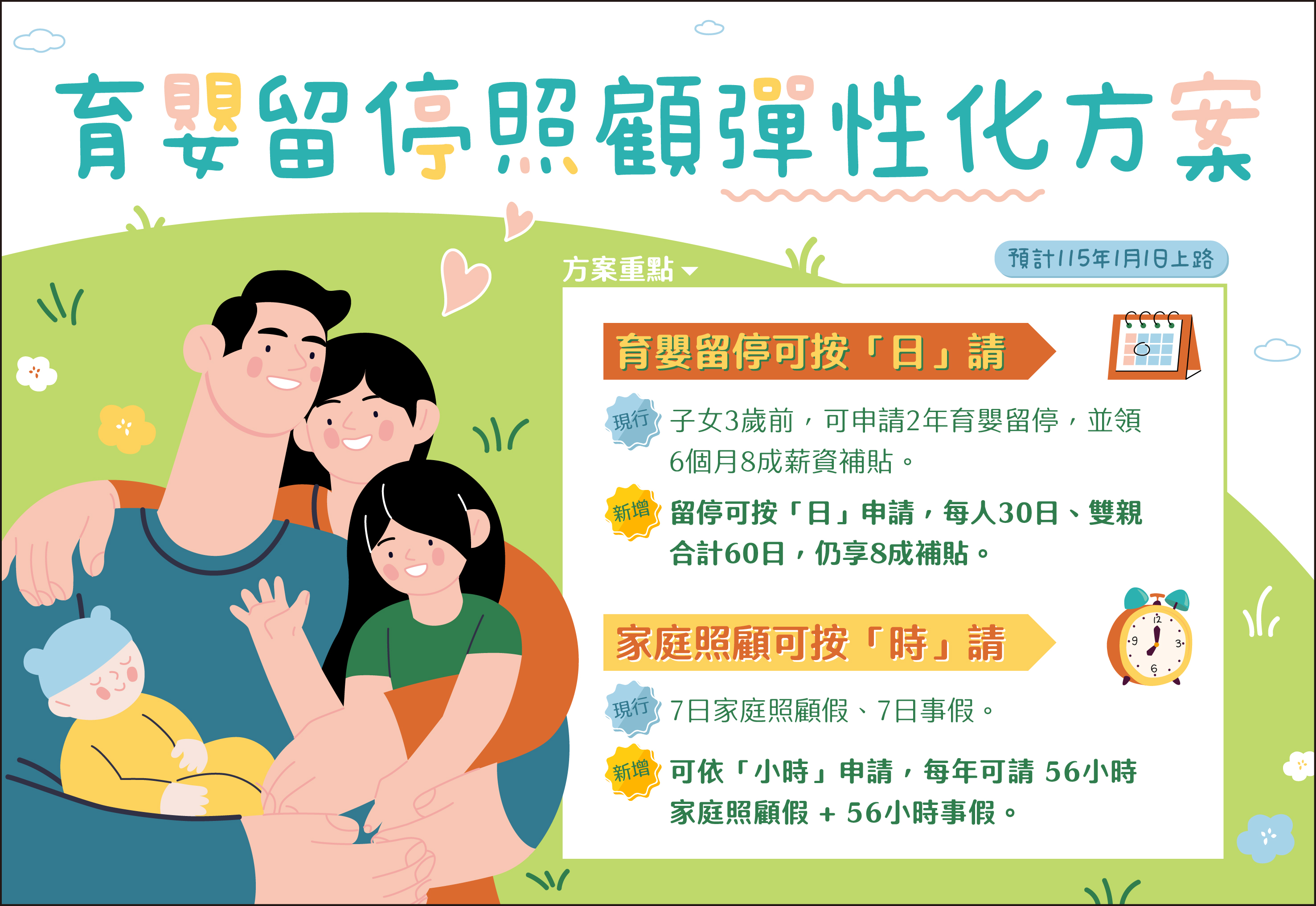 許多新手爸媽同時也反映,當孩子臨時生病或學校因故停課時,往往只需幾天到一週的照顧時間,但現行育嬰留職停薪(簡稱育嬰留停)制度規定單次申請至少30日,導致在工作與家庭間陷入兩難。政府為提升職場彈性並協助企業留才,將自明(115)年1月1日起推動「育嬰留停照顧彈性化方案」,使育嬰留停可按「日」申請,家庭照顧假可按「時」申請,以落實「雙就業、雙照顧」政策目標,達到「照顧不離職、勞工續留職場」。