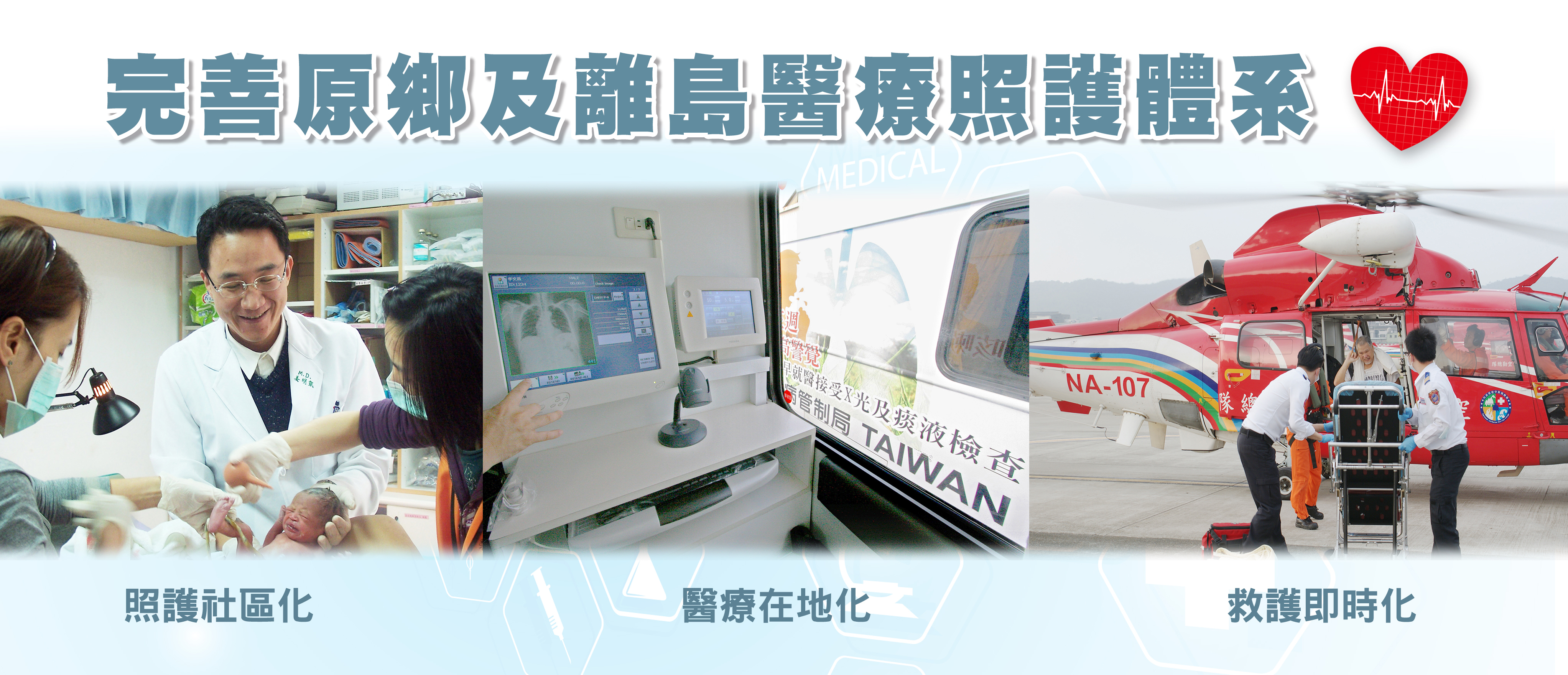 逐年協助原鄉離島衛生所或醫院建築物的整建,另已完成70處衛生所醫療資訊系統(HIS)及40處衛生所醫療影像傳輸系統(PACS)之建置,使衛生所得以透過影像傳輸系統,由部立醫院醫師協助判讀X光片、超音波及心電圖等醫學影像,提升醫療服務效能,每年約代讀代判9,000件。