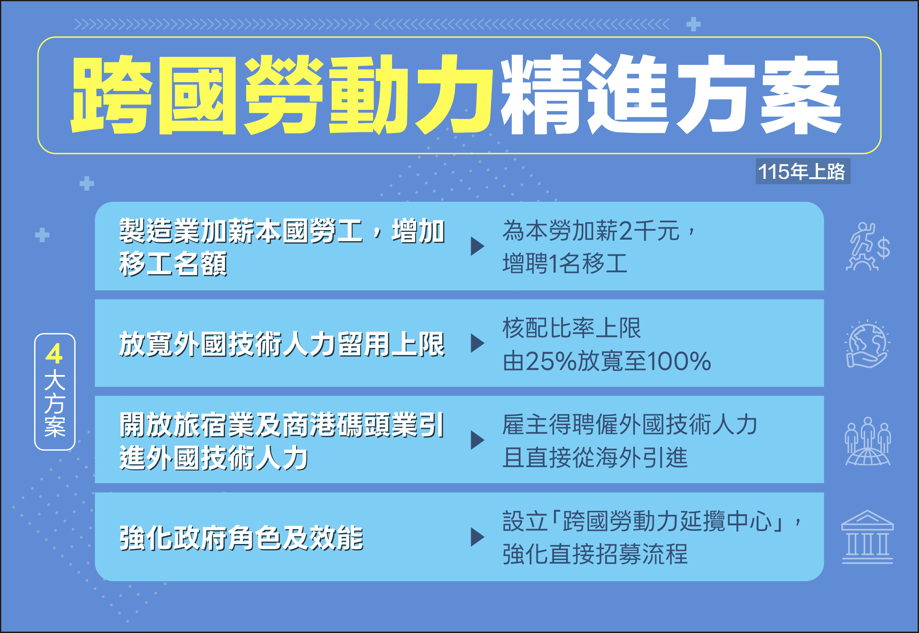 我國正面臨人口老化與少子化挑戰,工作年齡人口(15-64歲)持續減少,製造業、住宿業等產業普遍出現缺工現象,同時國內低薪問題亦受社會關注。為鼓勵企業提升本國勞工薪資與就業條件,避免低薪定錨現象,同時積極向外延攬跨國勞動力來協助產業解決缺工問題,政府提出「跨國勞動力精進方案」(115年上路),以「以本勞權益優先、強化人力素質、擴大用人留才、強化政府效能」為原則,兼顧產業用人需求並建立勞資雙贏機制。