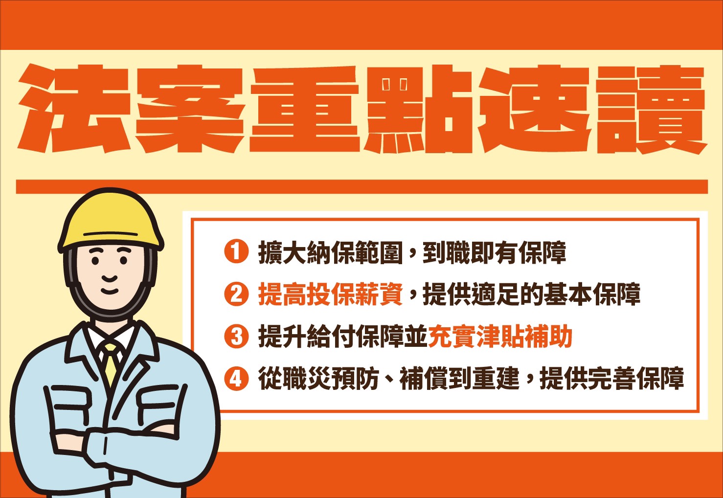臺灣經濟成績亮麗,勞工朋友功不可沒。為加強保障勞工權益,《勞工職業災害保險及保護法》是政府繼《就業保險法》後,又一部建構「職災預防、補償及重建」完善保障制度的社會保險專法,未來將全力落實,把職災風險降到最低,並提供職災勞工及家庭更快、更大、更周延的照顧與保障,打造一個更安全、健康的勞動環境。