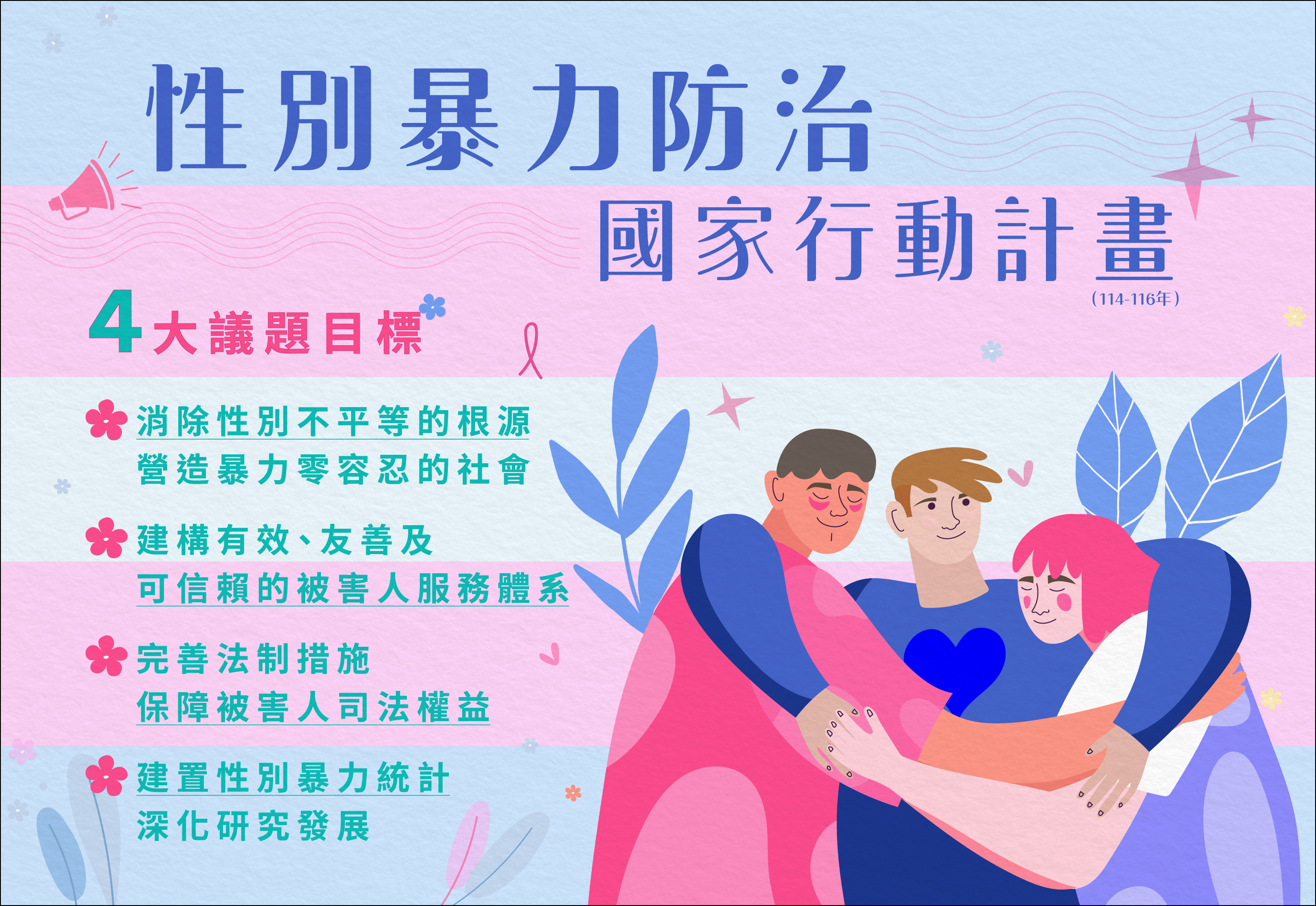 隨著網路科技發展,性別暴力類型更加多元化,不再侷限於言語和身體的侵害。為有效遏制此類暴力的發生,我國除陸續透過制定或修正相關法條,以完善法制面外,為建立一個全面的國家級防治策略,行政院再提出「性別暴力防治國家行動計畫」(114-116年),期藉由政府部門間橫向協調、整合的方式,涵蓋所有性別暴力類型及現行暴力防治網絡,消除從根本上導致性別暴力的偏見和歧視,並強化預防、保護、起訴、賠償、監測和資料蒐集等相關措施,綿密人身安全防護網絡,防治實體與數位性別暴力之侵害。