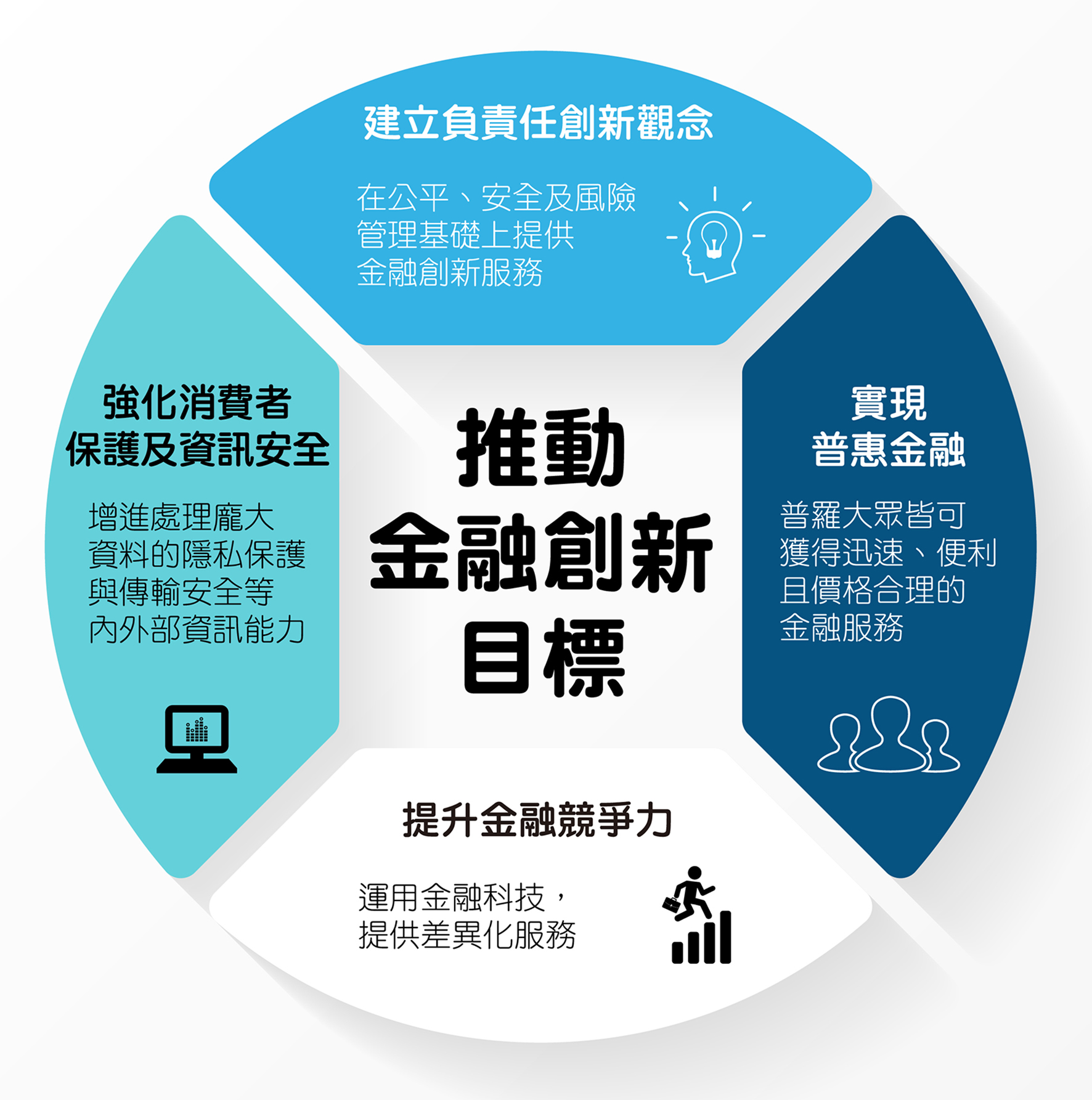 因應金融科技及數位經濟的快速發展,政府將持續推動各項鼓勵創新措施,建置金融科技友善環境。同時也鼓勵業者掌握經濟與社會結構變遷脈動,提升創新能力,持續運用科技提高金融服務效率及品質,積極創新金融商品及經營模式,滿足民眾多元金融需求。